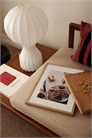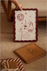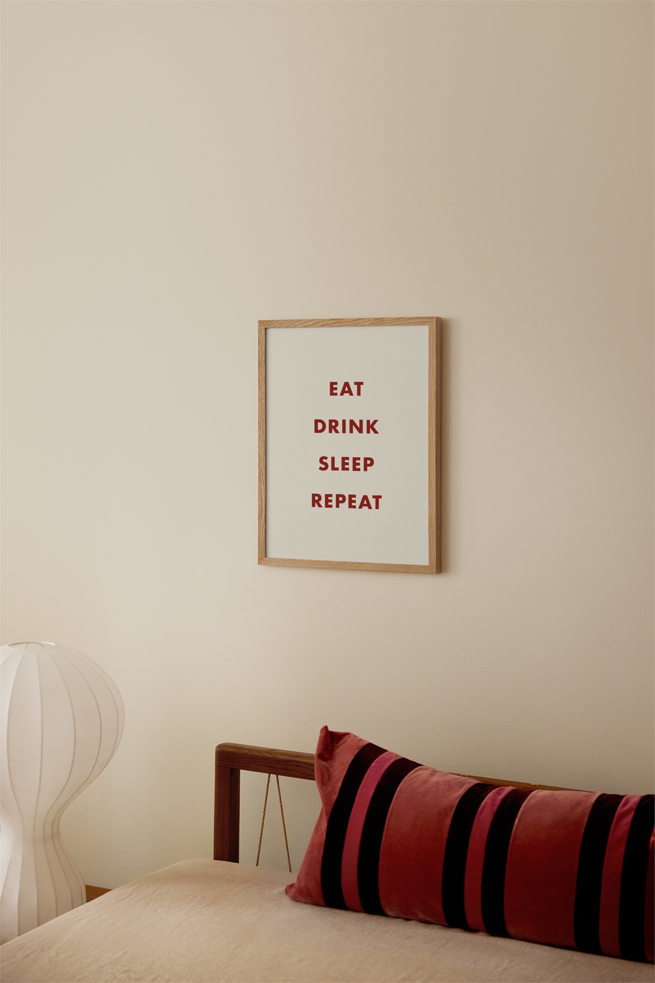 Мотив с английским текстом, написанным красным цветом, изображен на бежевом фоне.