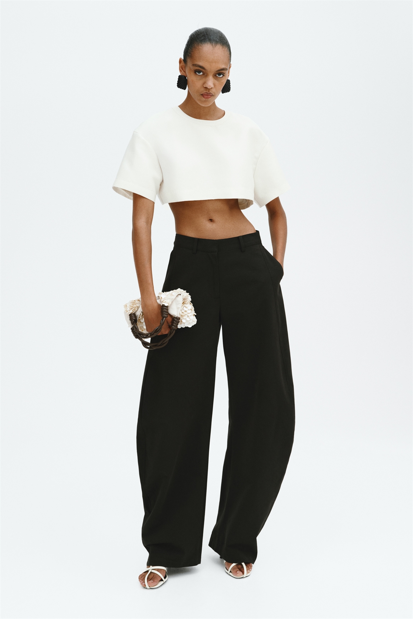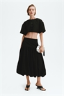 Укороченный топ из тканого материала с легким блеском. Имеет круглый вырез, спущенные плечи и короткие рукава. Видимая застежка-молния сзади и прямой крой по низу. На подкладке.
