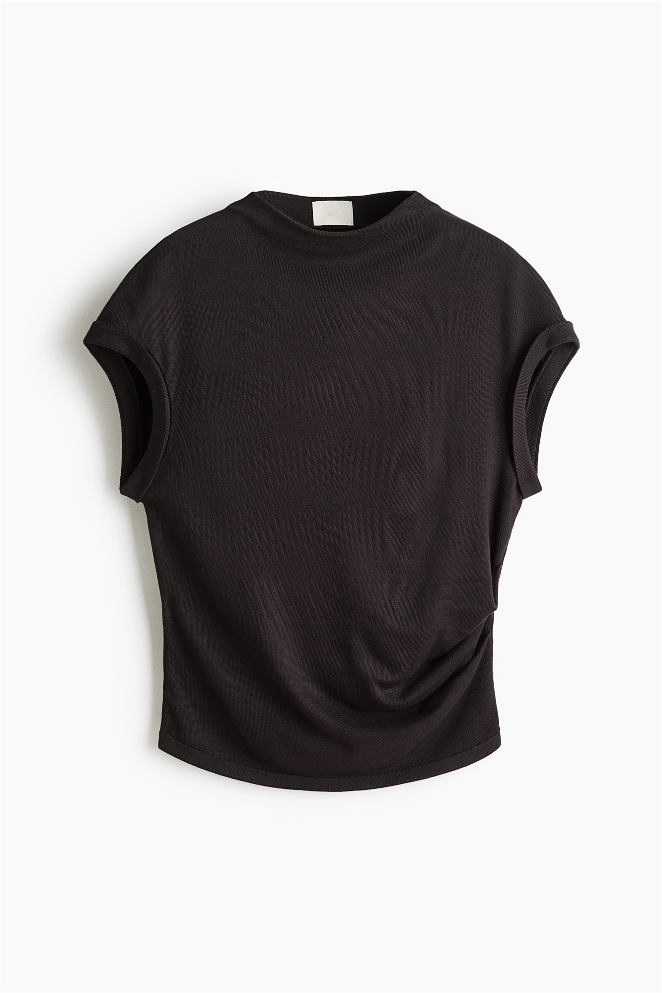 Топ с короткими рукавами из тонкого трикотажа на основе вискозы с небольшим воротником-стойкой, складками на манжетах и складками на талии с одной стороны для легкой драпировки.