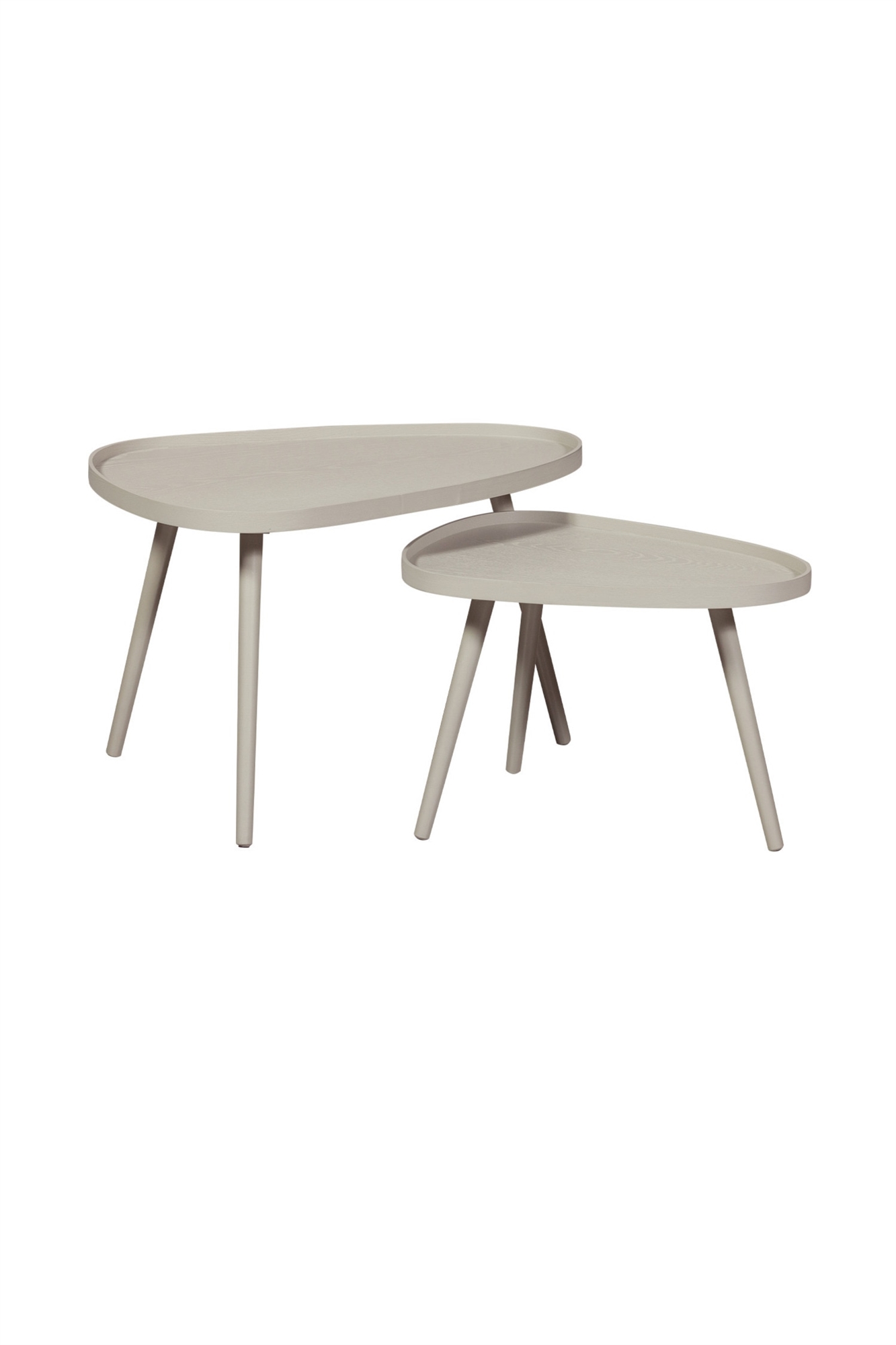 Этот комплект из 2 журнальных столиков от WOOOD сочетает в себе органические формы и элегантный внешний вид. Разная высота создает динамичный и игривый общий вид, который придает характер любой комнате. Видимая текстура дерева и теплый цвет подчеркивают элегантный вид, а приподнятый край предотвращает скольжение предметов. Столешница изготовлена из МДФ, ножки - из древесины сосны. Размеры: большой стол В 38,3 x Ш 71 x Г 51 см, маленький стол В 47 x Ш 55 x Г 40 см.