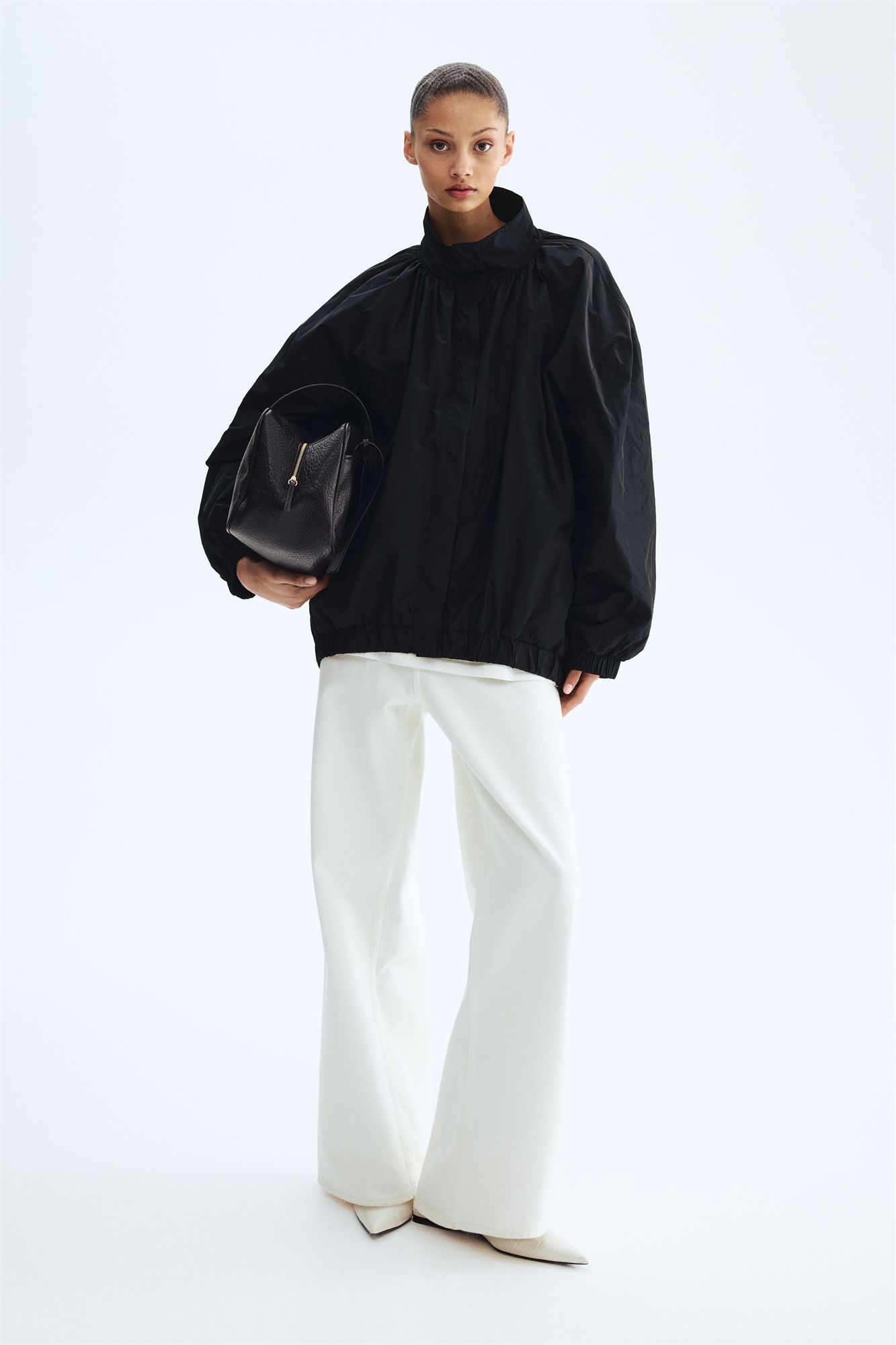 Оверсайз-жакет из тканого материала с легким блеском. Имеет воротник-стойку со сборками по всему периметру и потайные кнопки по всей длине спереди. Низкие спущенные плечи и скрытая резинка на манжетах и по низу. Сзади длиннее. На подкладке.