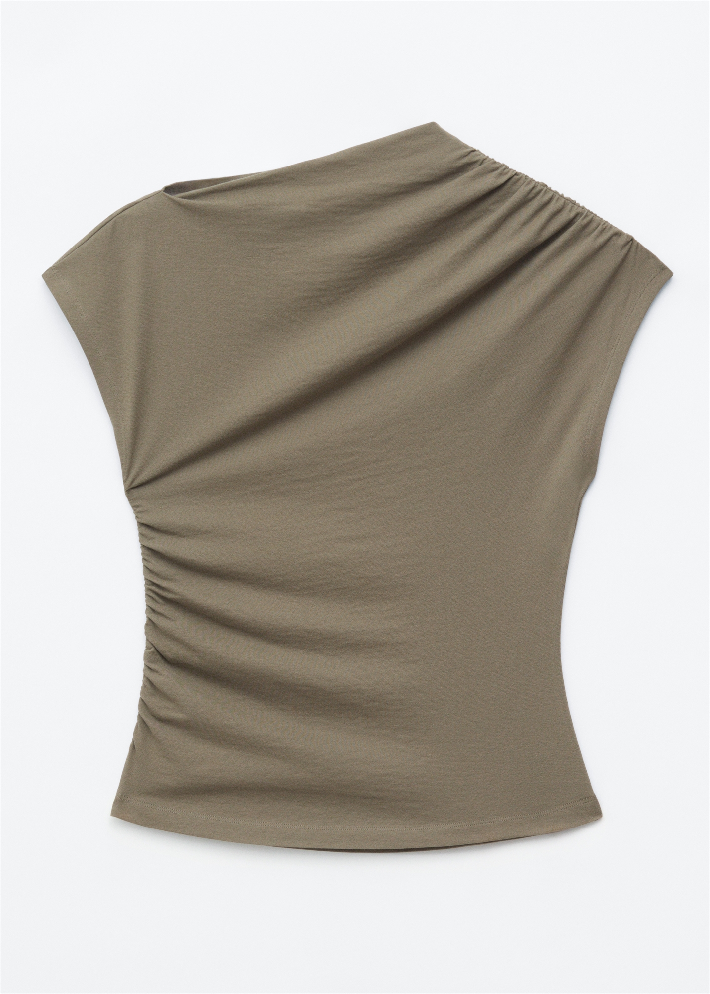 Топ с короткими рукавами из струящегося эластичного хлопкового джерси с сборками, создающими эффект драпировки по всей поверхности. Сборки начинаются у линии декольте, проходят к одному плечу и продолжаются вдоль противоположного бокового шва.