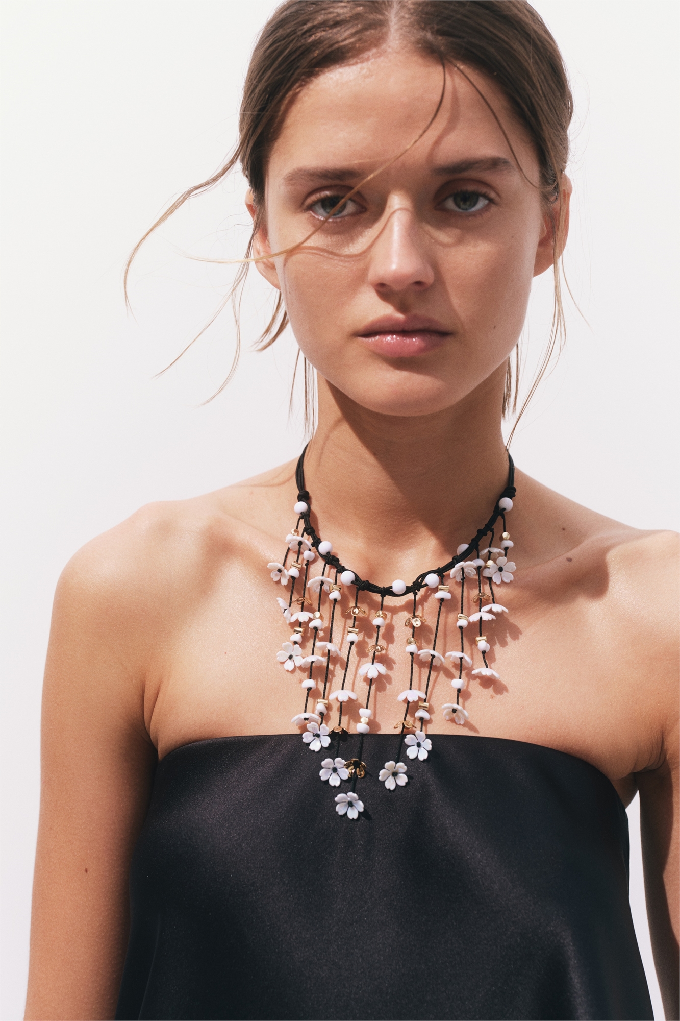 Ожерелье из шнурка с нитями, спускающимися каскадом, украшенное бусинами в форме цветов, создающими красивый эффект водопада. Регулируемая длина с застежкой-карабином.