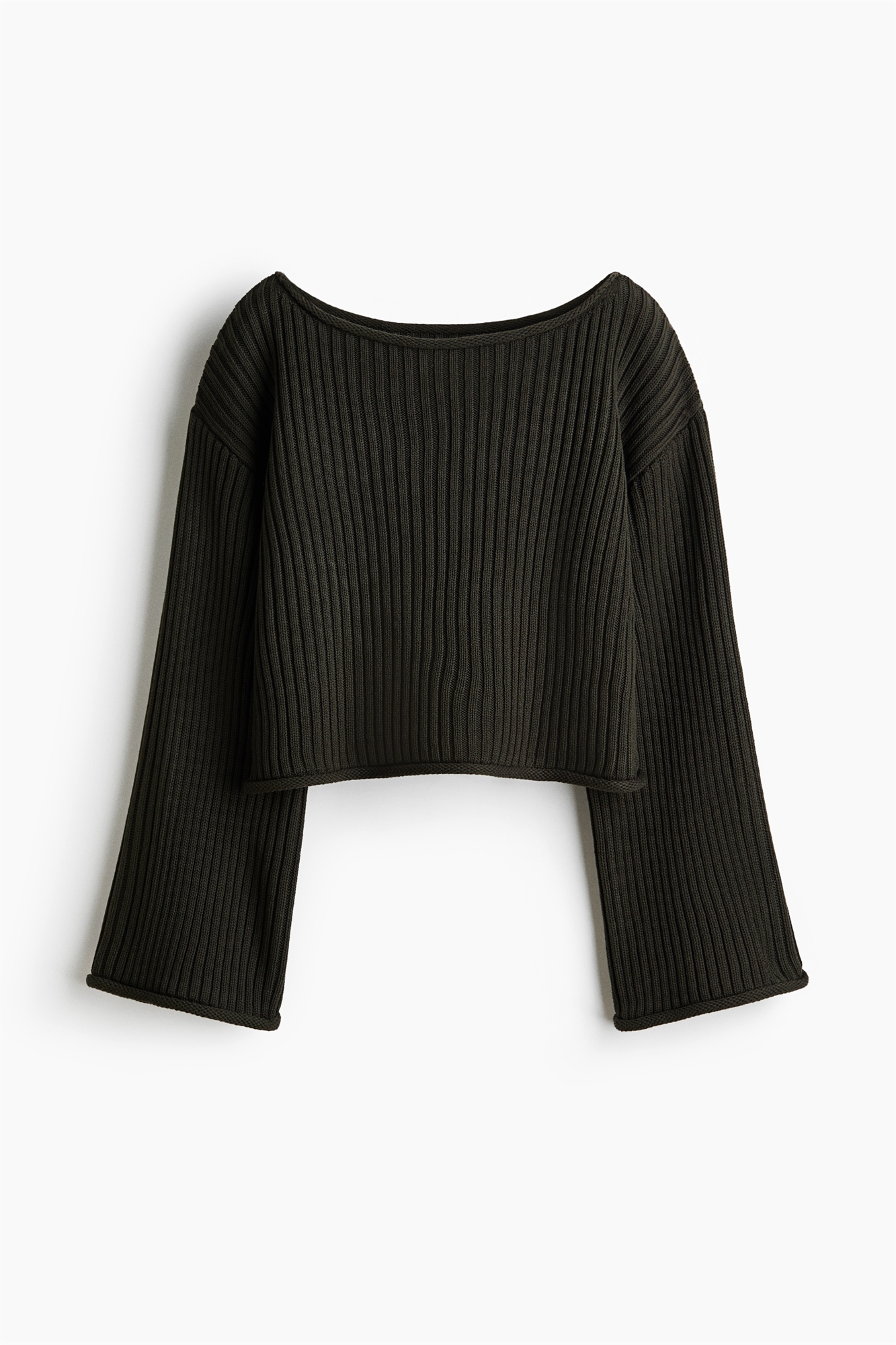 Короткий джемпер из мягкого ребристого трикотажа с закатанными краями. Имеет лодочный вырез, заниженные плечи и длинные рукава-трубы.