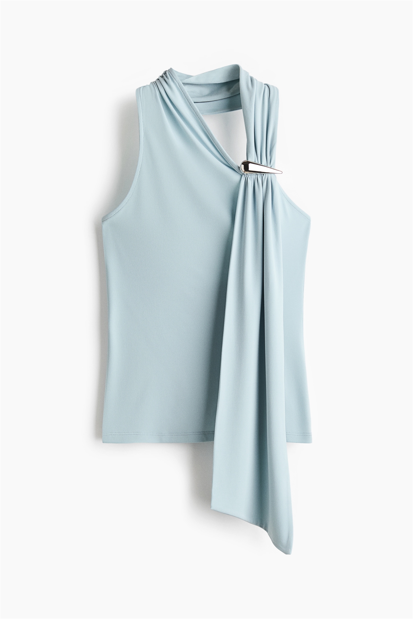 Приталенный топ из мягкого джерси с асимметричным вырезом и широким шарфом-хомутом с металлической деталью и сборкой на одной стороне спереди для создания эффекта драпировки.