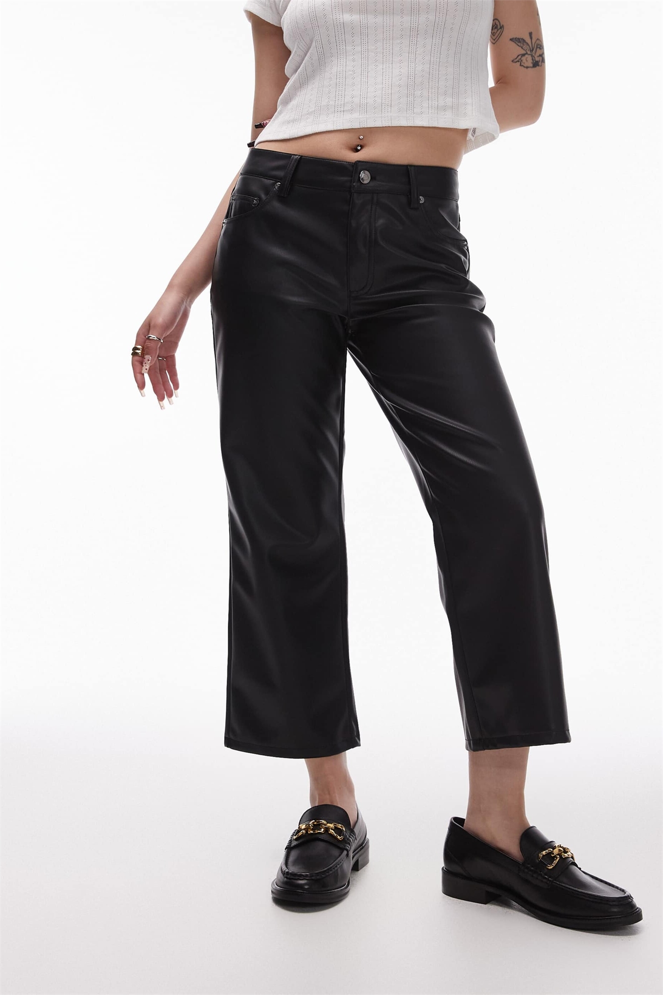 Брюки из искусственной кожи с прямыми брючинами и длиной до щиколотки, черного цвета