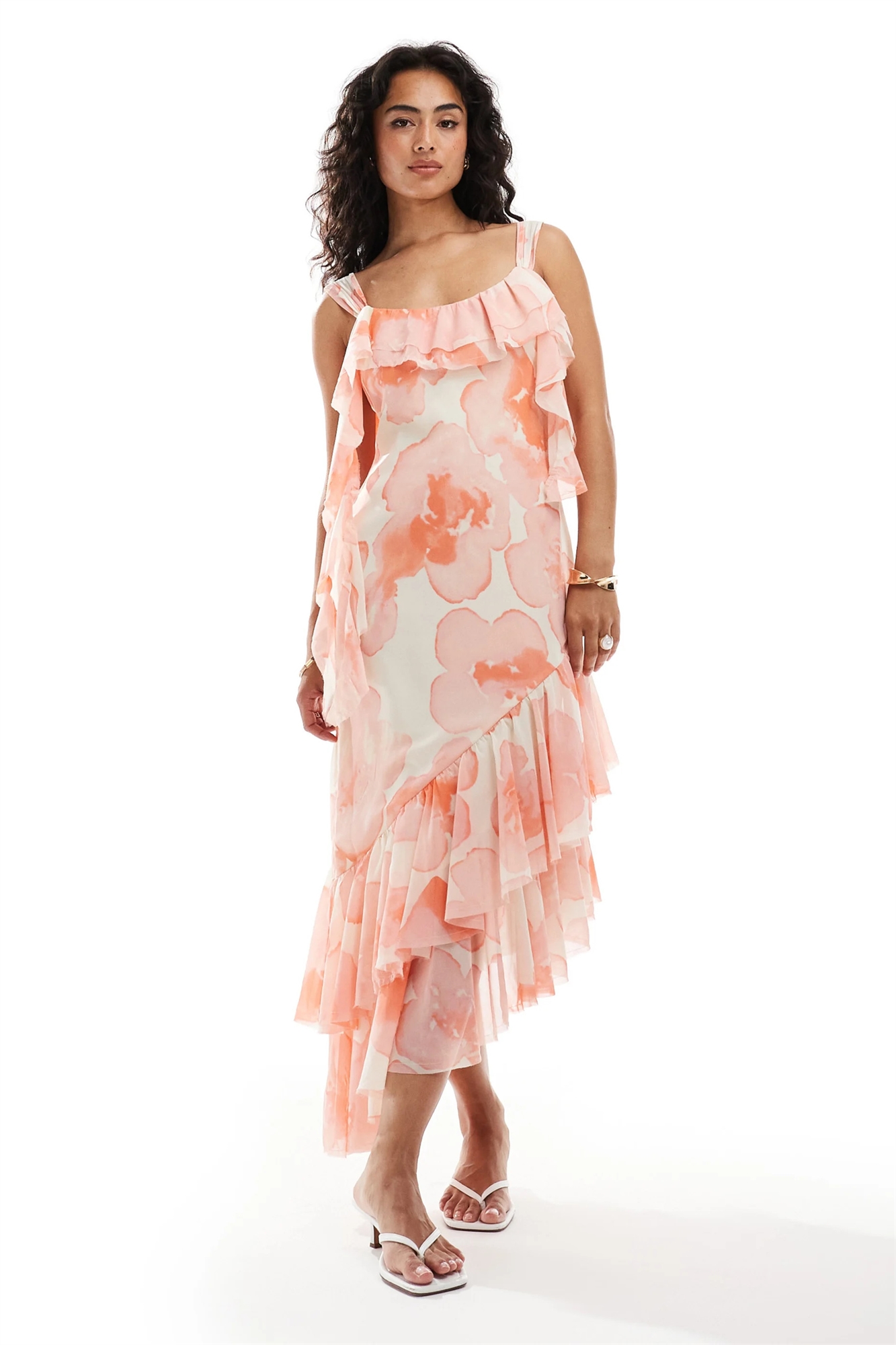 Платье средней длины с необработанными краями и двойным воланом по подолу
