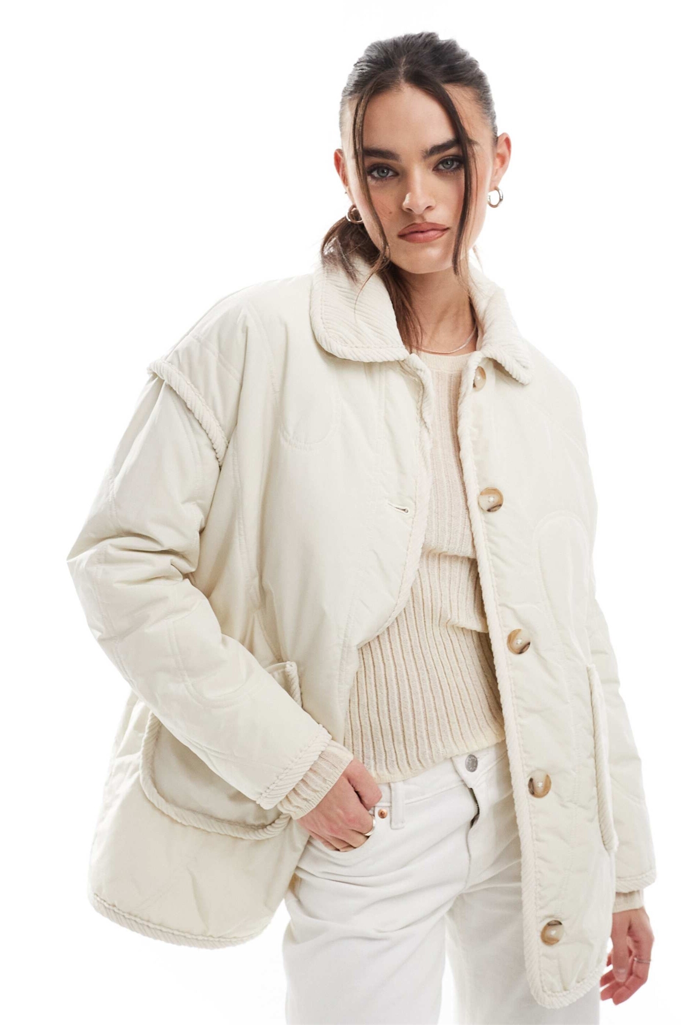 Стеганая куртка с кожаными деталями кремового цвета