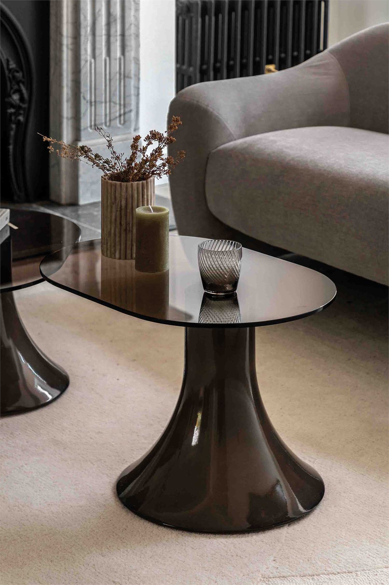 Этот приставной столик, выполненный в современном итальянском стиле с ноткой ретро, станет стильным дополнением любого современного интерьера. Расклешенная основа изготовлена из армированного стеклобетона и покрыта насыщенной глазурью цвета угольного коричневого. Столешница из закаленного стекла имеет нежный коричневатый оттенок, придающий дизайну глубину и изысканность. Размеры: Ш445 мм × Г655 мм × В380 мм