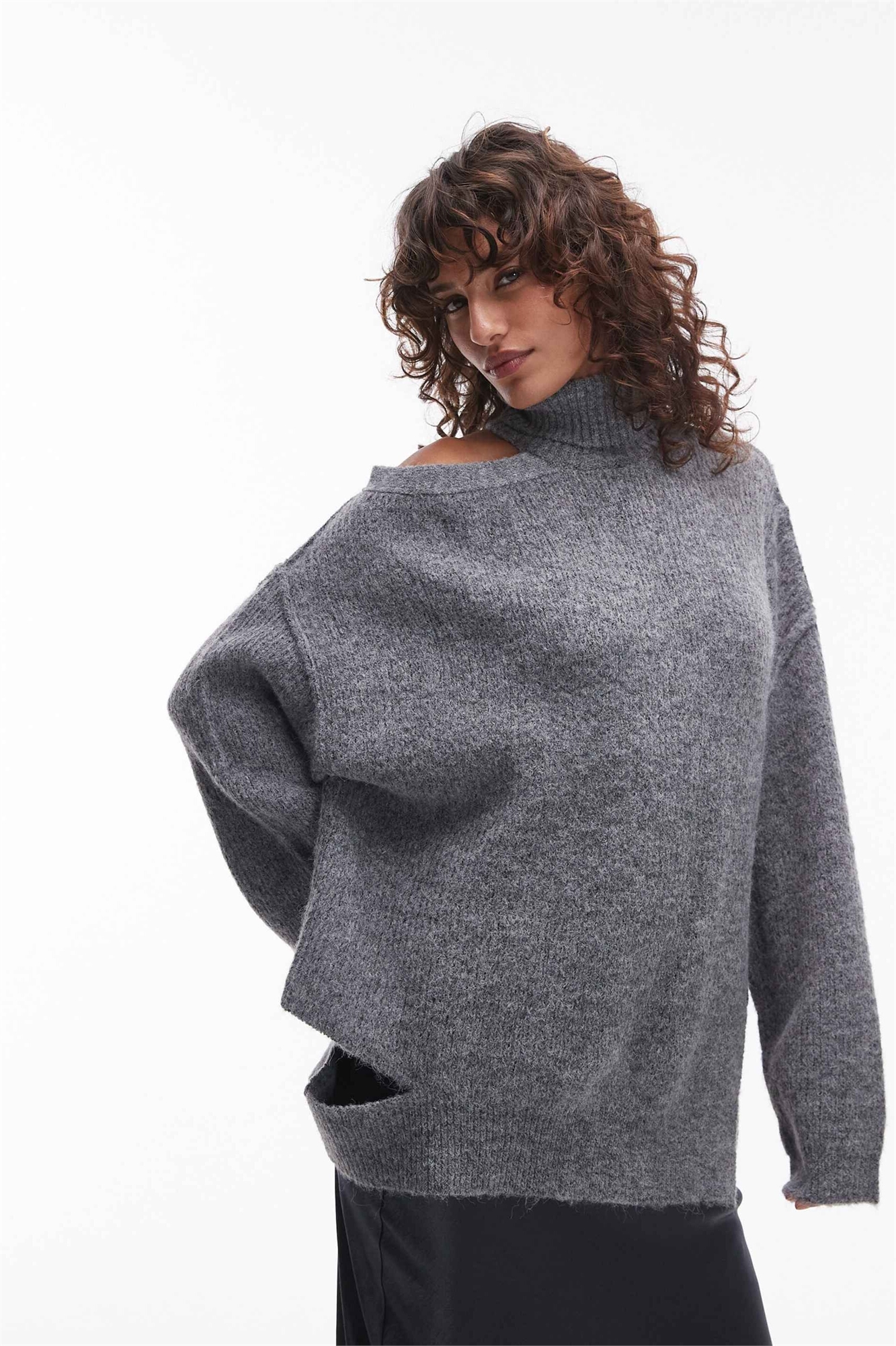 Вязаный свитер свободного кроя с асимметричным вырезом и воротником-воронкой