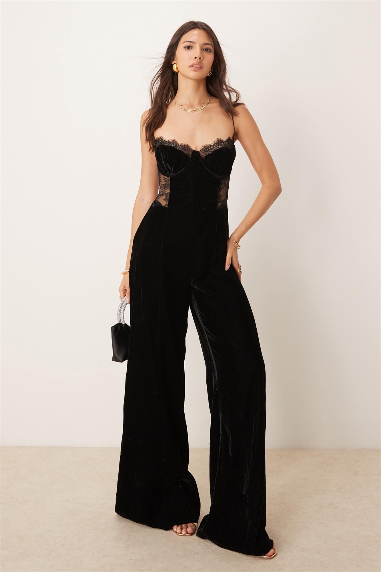 Бархатный комбинезон-топ с кружевной вставкой