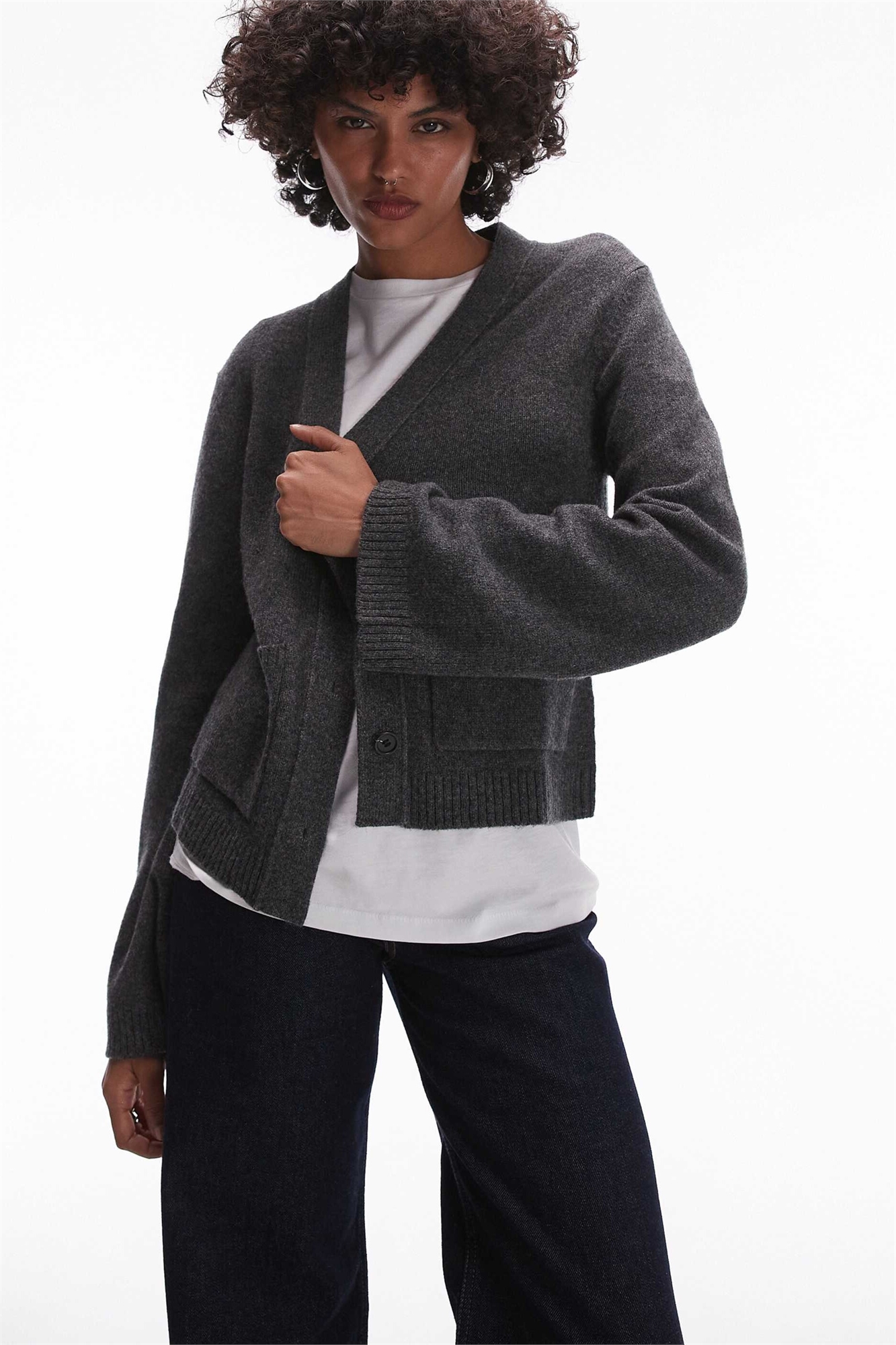 Кардиган из шерстяной текстурированной пряжи с V-образным вырезом и карманами спереди