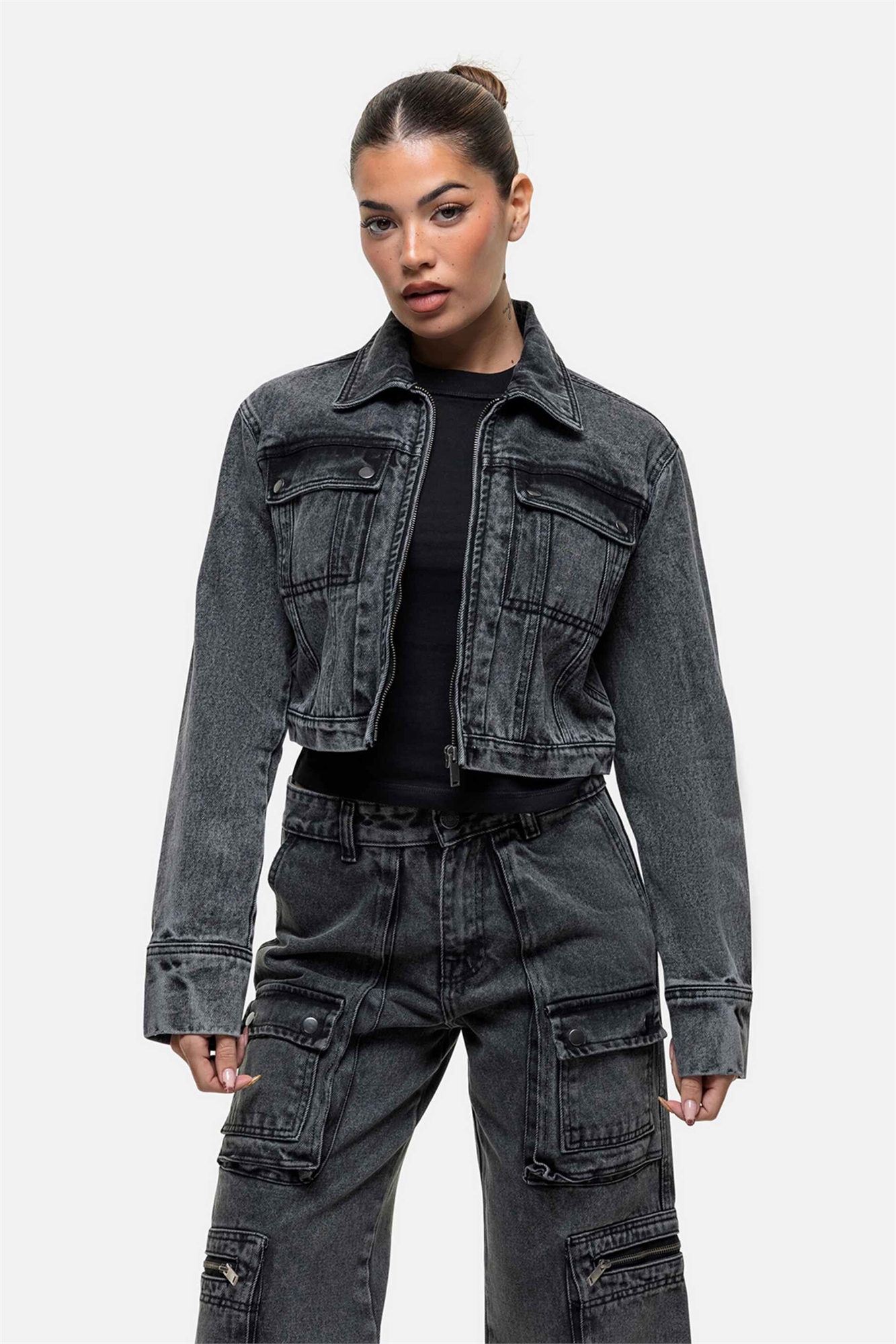 Короткая джинсовая куртка из координированной ткани черного цвета с кислотной обработкой