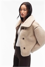 Объемная куртка из искусственной овчины с воротником-воронкой и контрастной окантовкой
