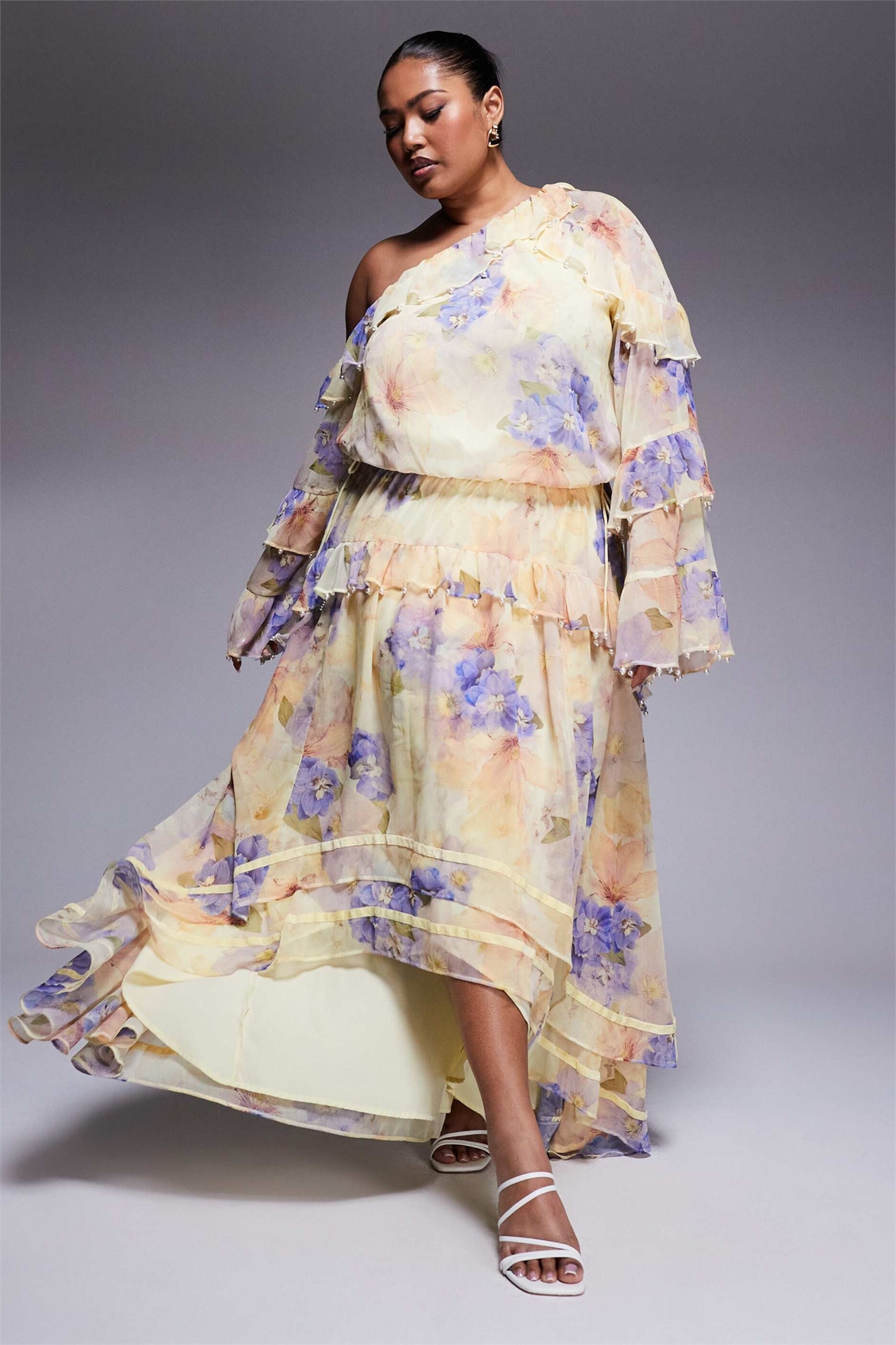 Макси-платье из шифона с обильным кроем, украшенное жемчужными вставками