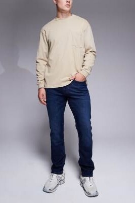 Неэластичный деним: темно-синяя стирка Основной материал: 98% хлопок, 2% эластан.