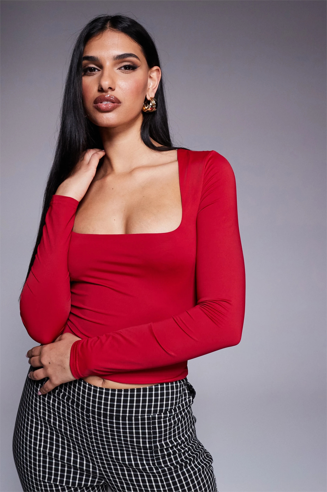 Двухслойный облегающий топ с квадратным вырезом и длинными рукавами