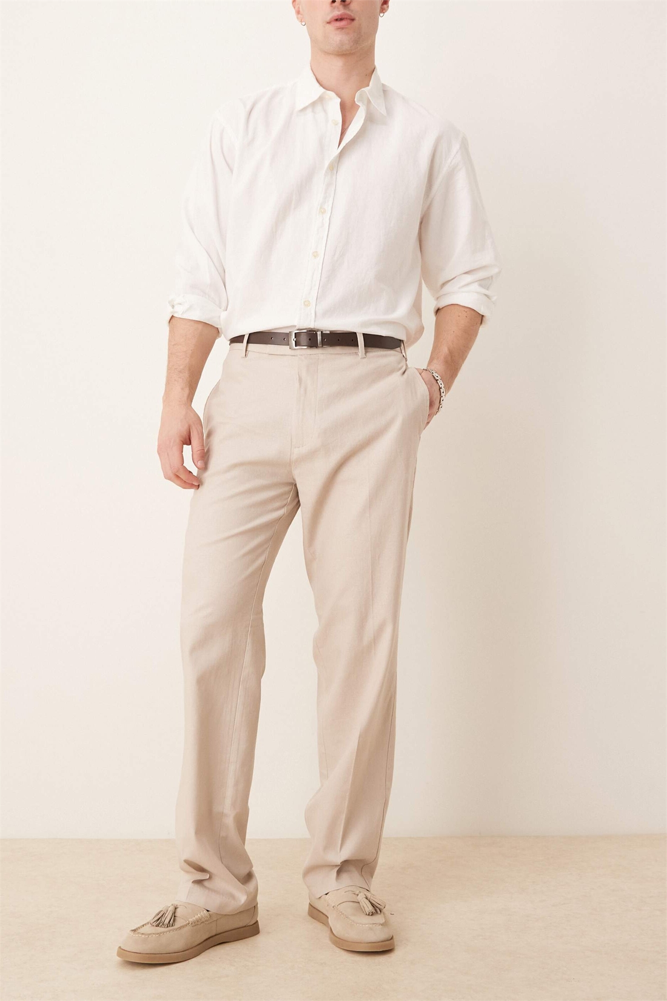 Изготовлено из льна, дышащей ткани с неровной текстурой. Основной материал: 50% лен, 48% вискоза, 2% эластан. Подкладка: 85% полиэстер, 15% хлопок.