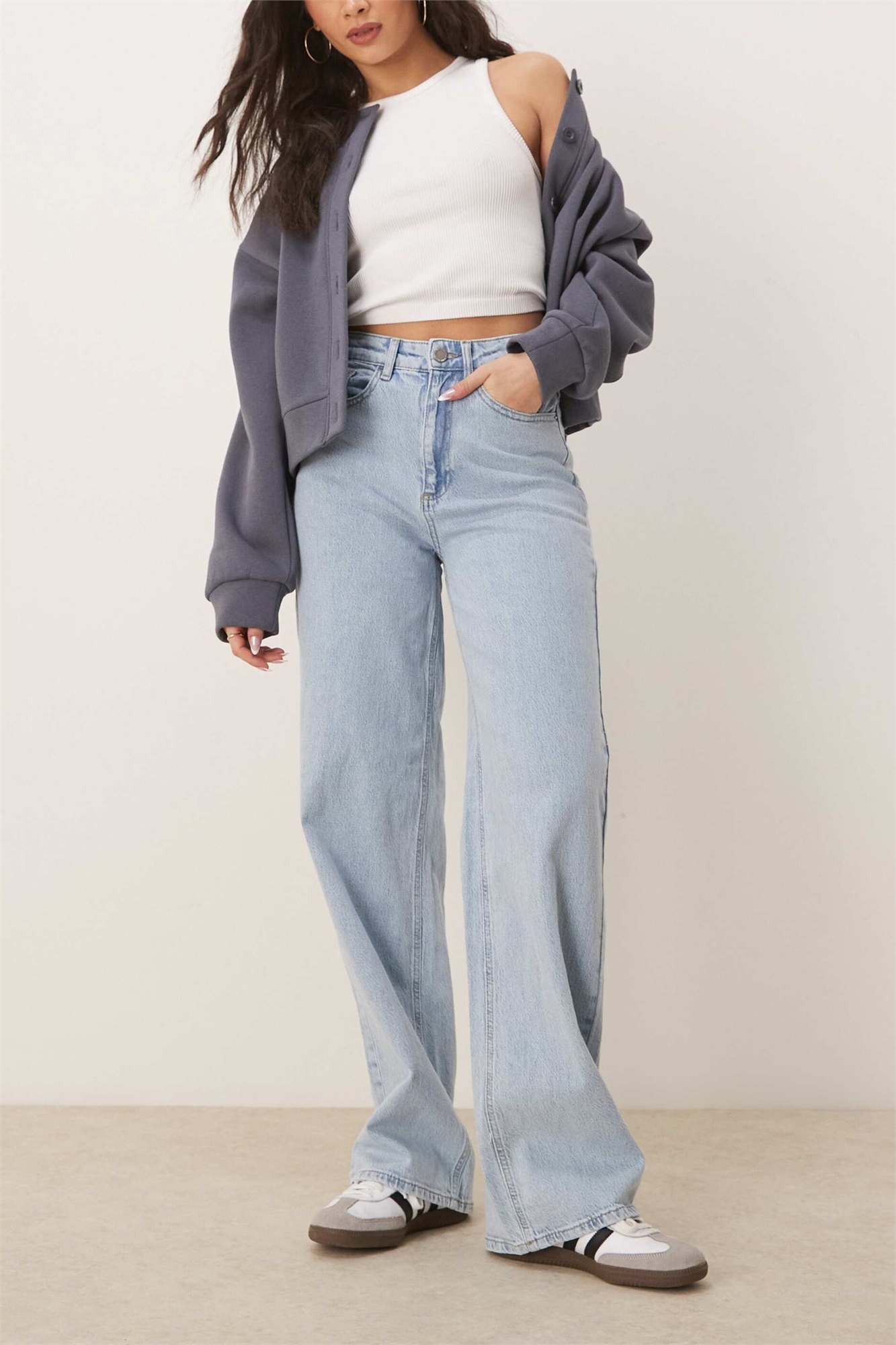 Неэластичный деним: светло-голубой оттенок Основной материал: 99% хлопок, 1% эластан.