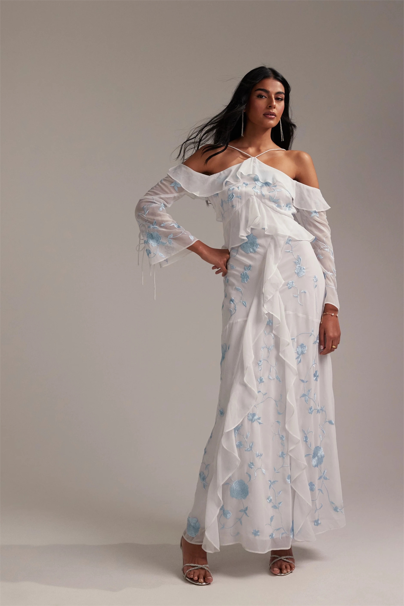 Макси-платье с рюшами и открытыми плечами для подружек невесты