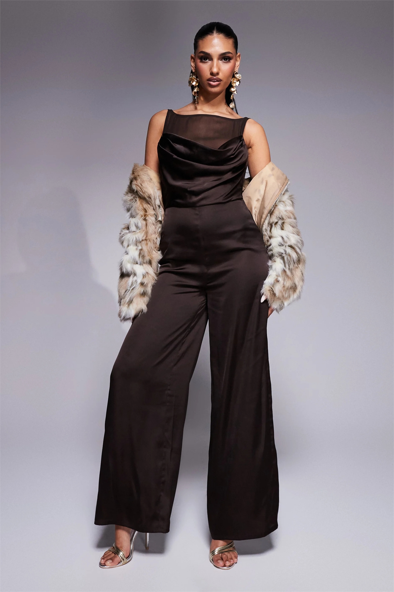 Комбинезон из атласа с высоким воротником, прозрачной подкладкой и застежкой-пряжкой сзади