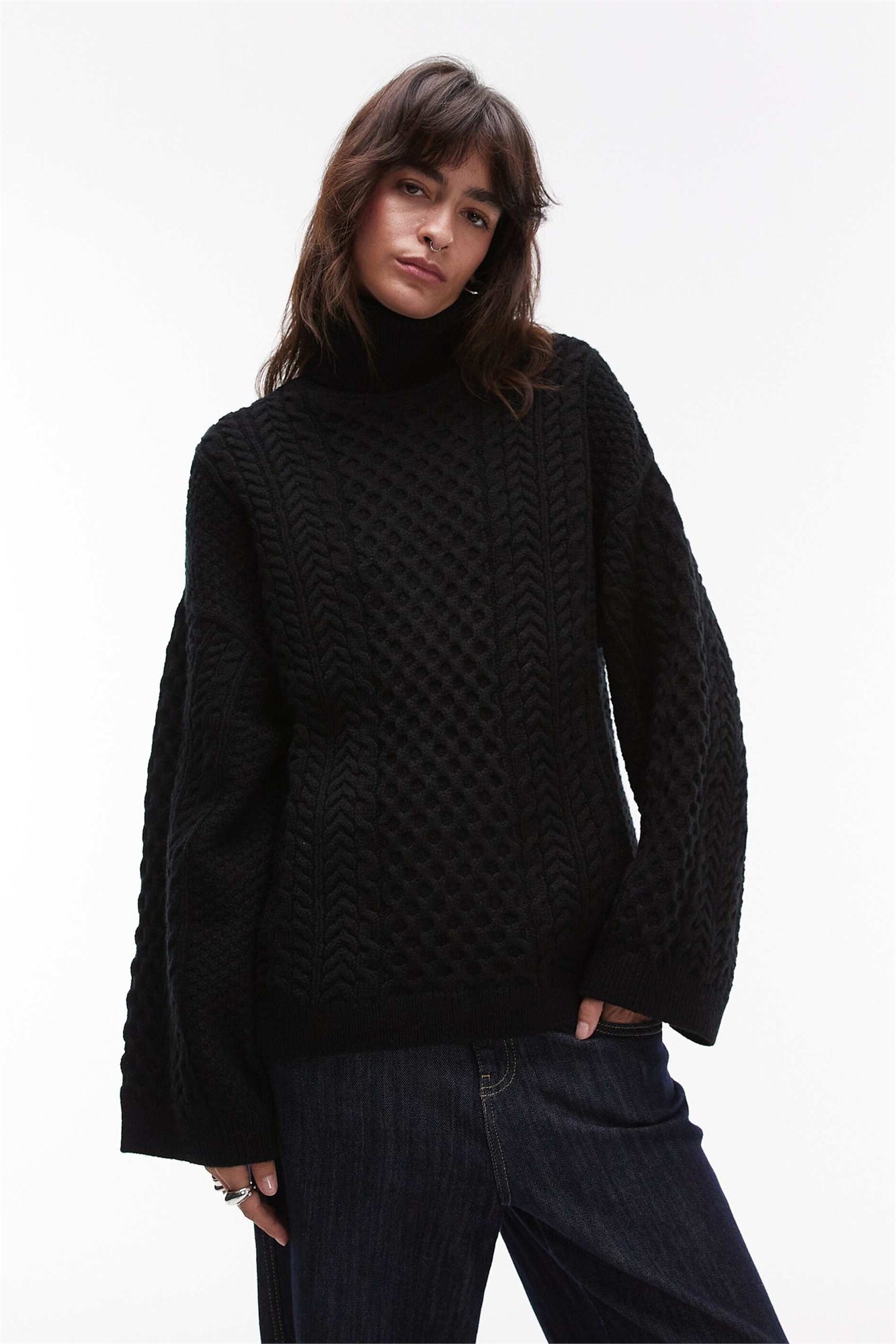Свитер с косой вязкой и декоративным узором, с высоким воротником, черного цвета