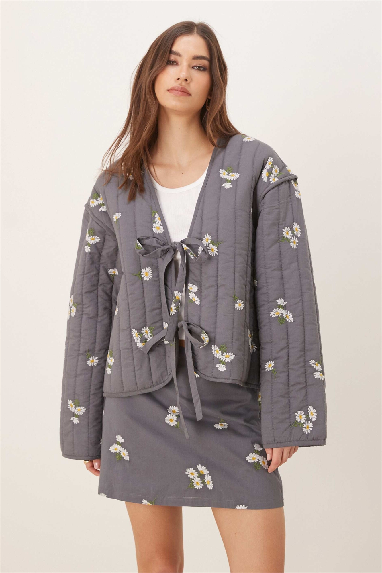 Куртка с завязками спереди, стеганая, с вышивкой, вымытого серого цвета