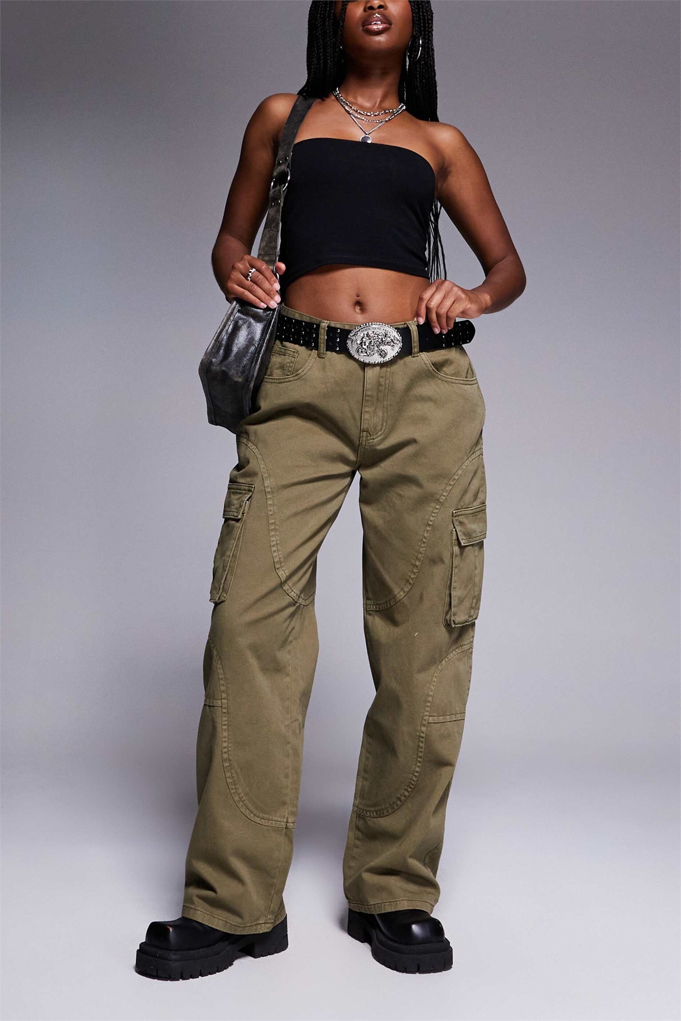 Джинсы-багги с деталями швов в стиле карго, цвет хаки