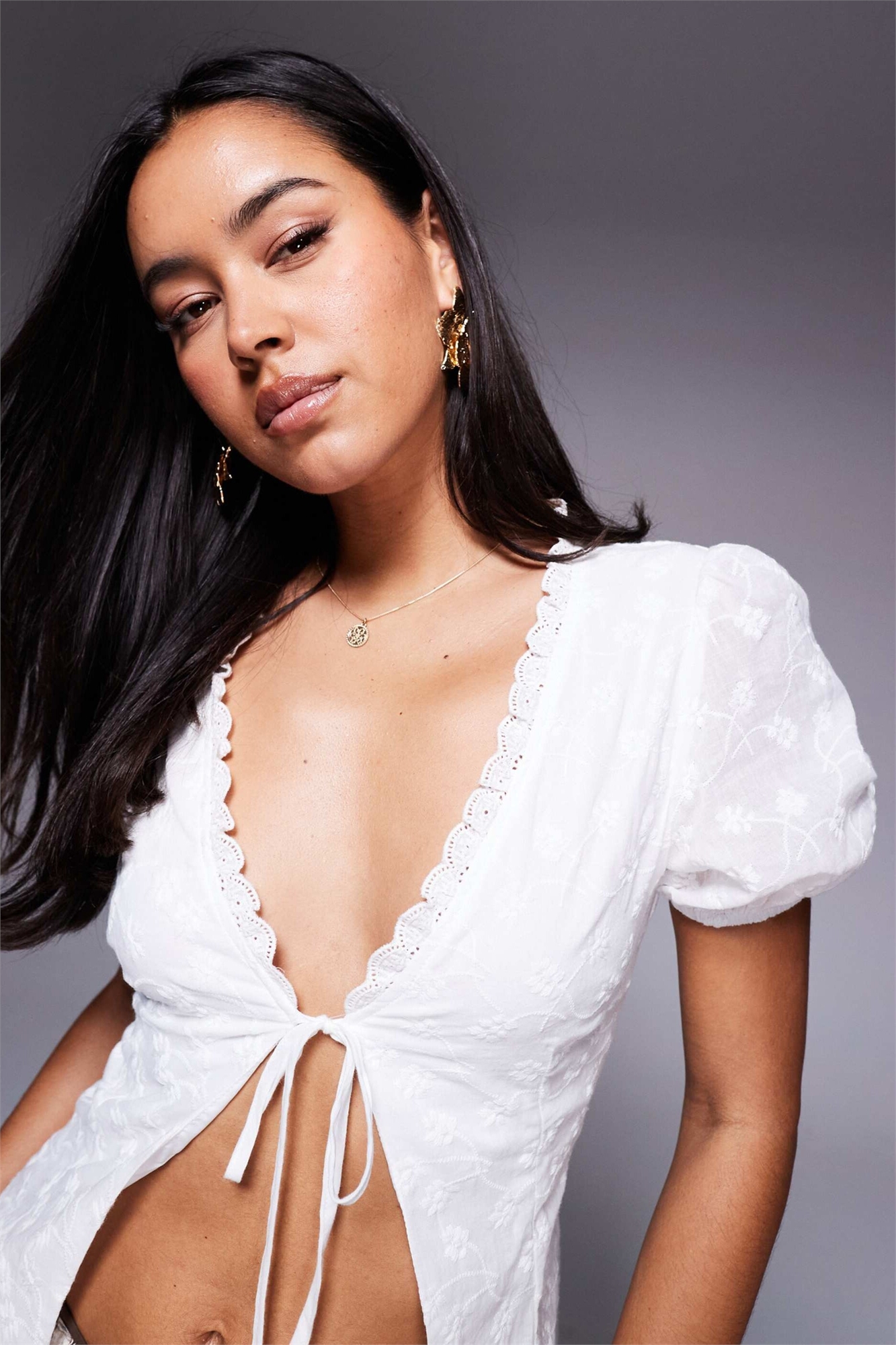 Топ с вышитой кружевной отделкой, буфчатыми рукавами, завязками и разрезом спереди