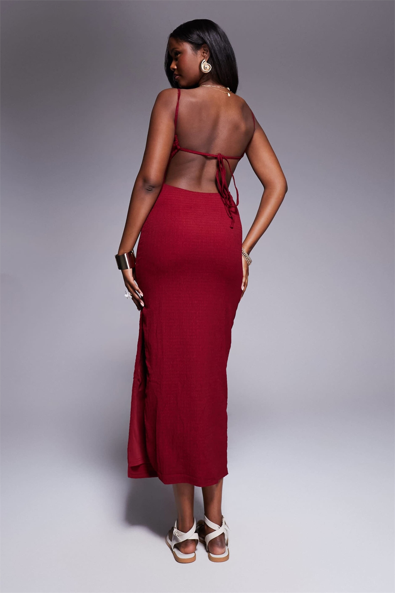 Платье-миди с облегающим силуэтом, текстурированной тканью, круглым вырезом и завязками на спине