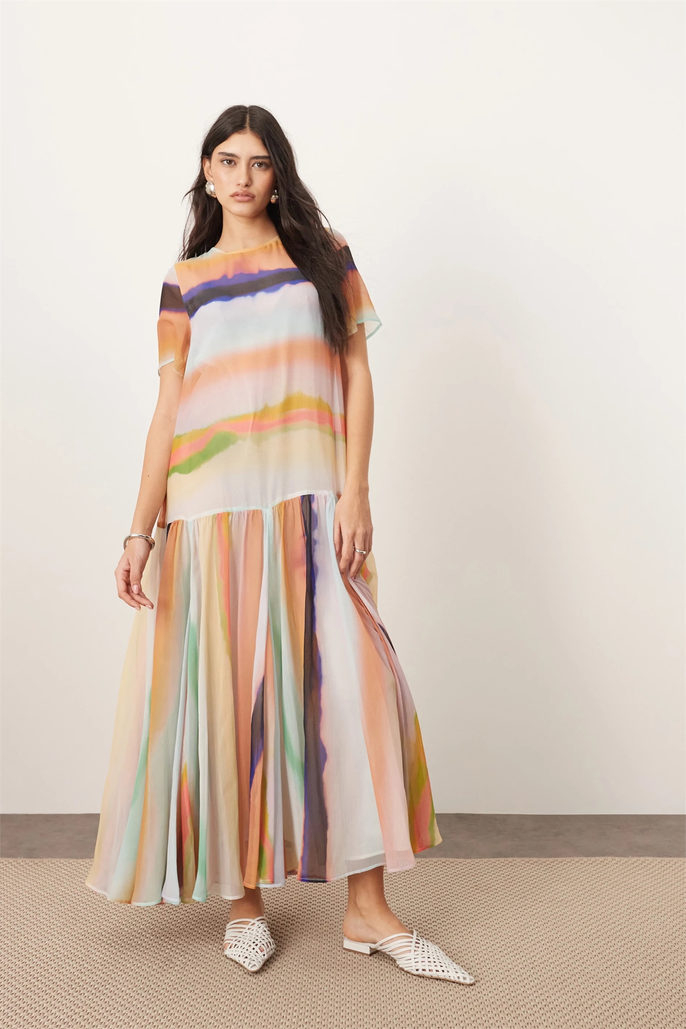 Макси-платье-футболка из прозрачного шифона с заниженной талией