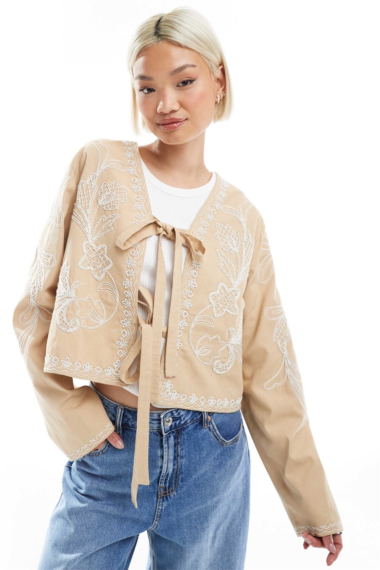 Укороченный жакет с вышитым бантом спереди