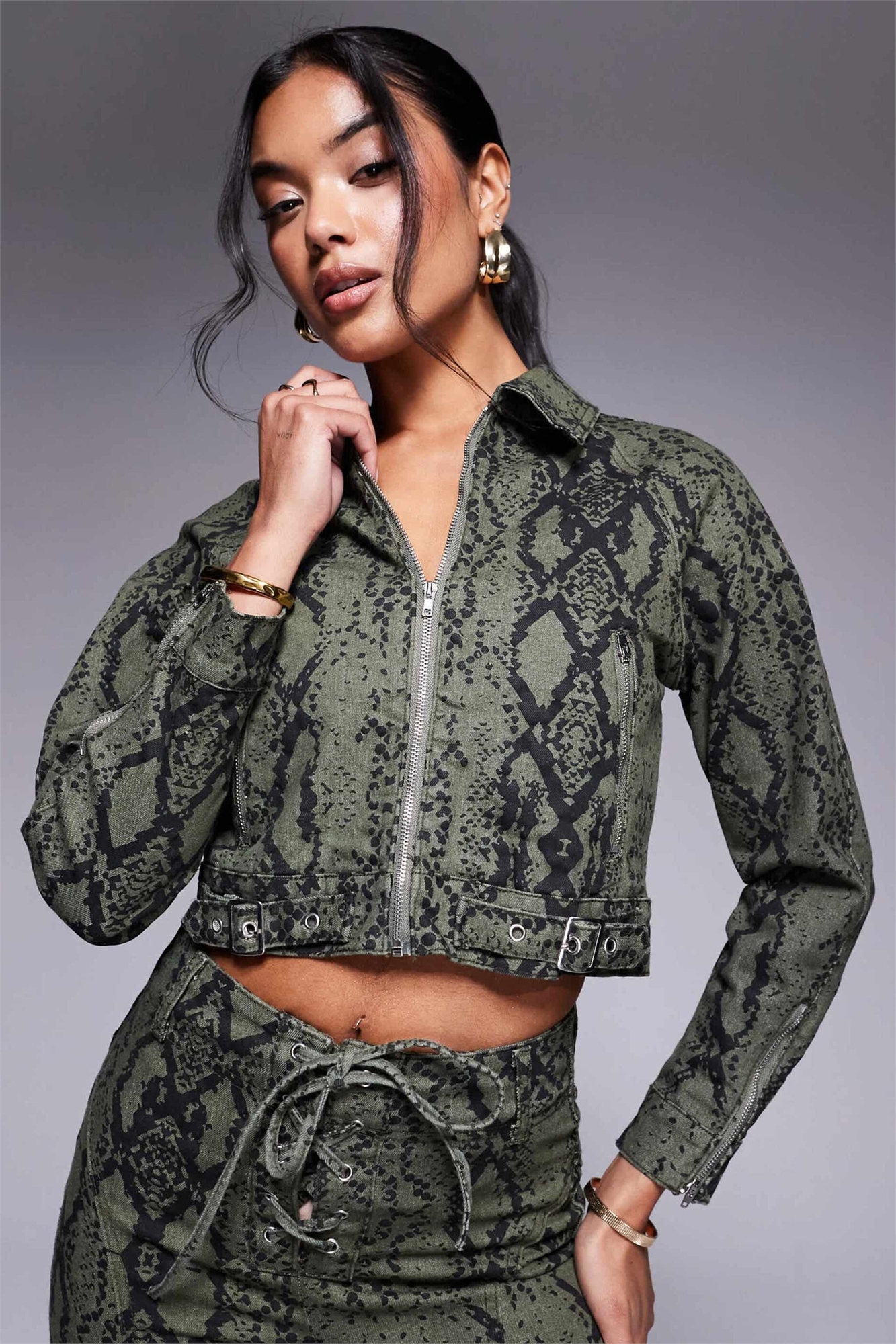 Укороченный жакет из комплекта хаки с принтом под кожу змеи