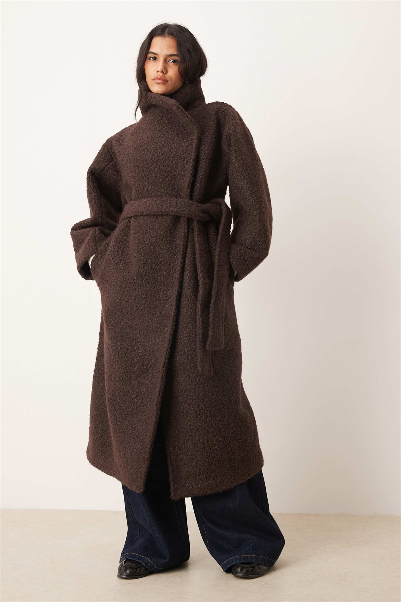 Поясной пальто-миди с воротником-воронкой коричневого цвета