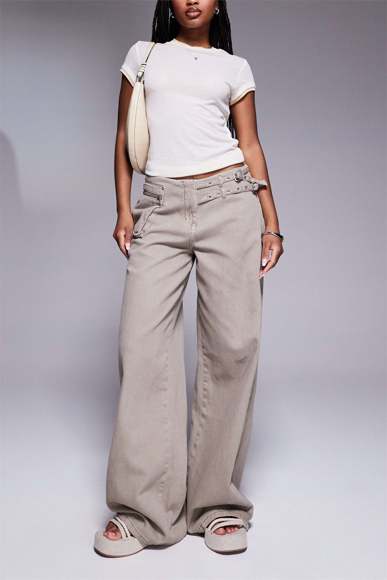 Джинсы с широкими штанинами, пряжкой и карманами, вымытого коричневого цвета