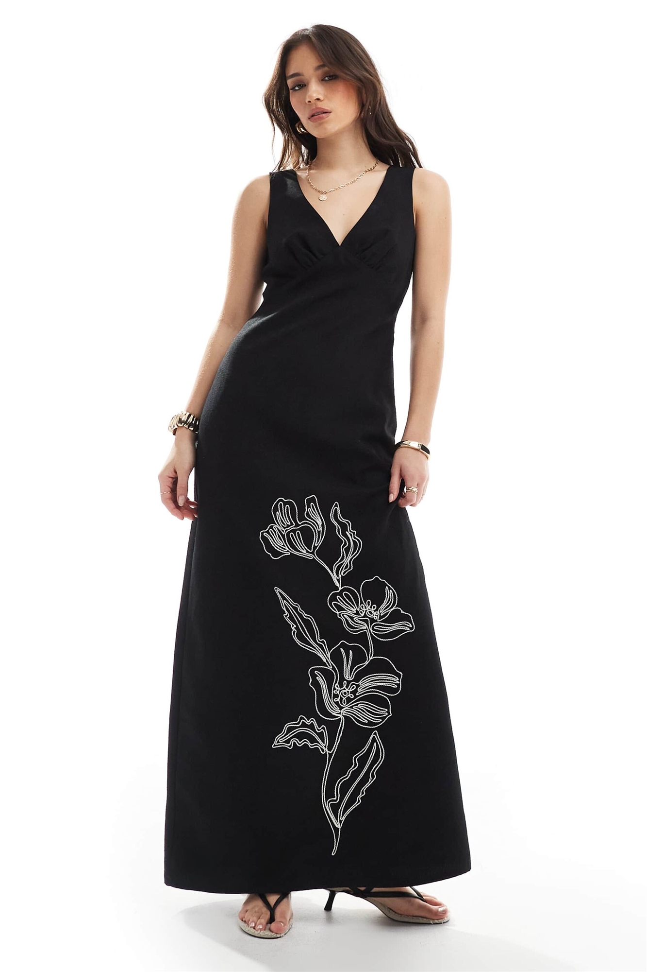 Макси-платье с V-образным вырезом, с цветочной вышивкой, под имитацию льна