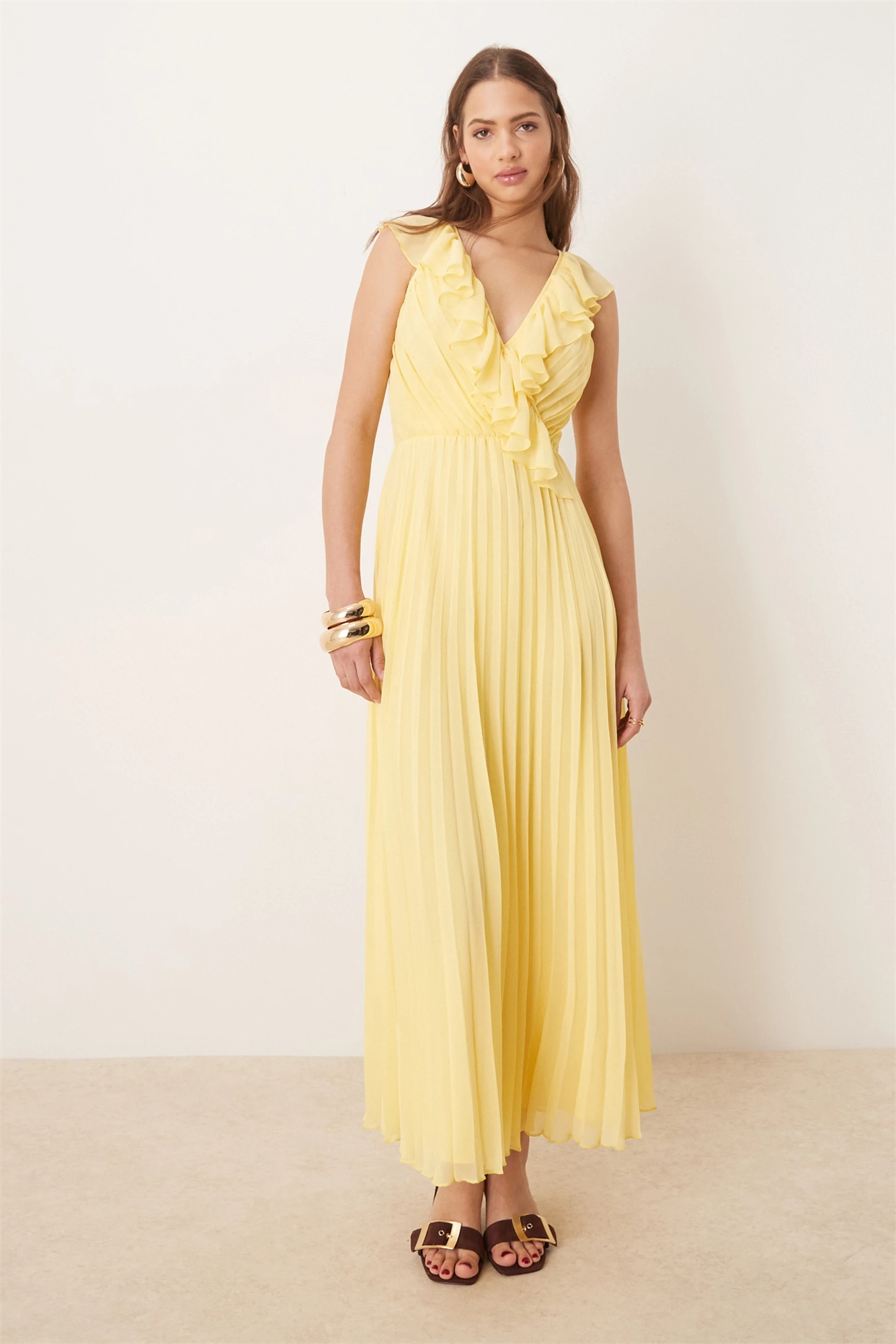 Платье средней длины с оборками, запахом и плиссировкой