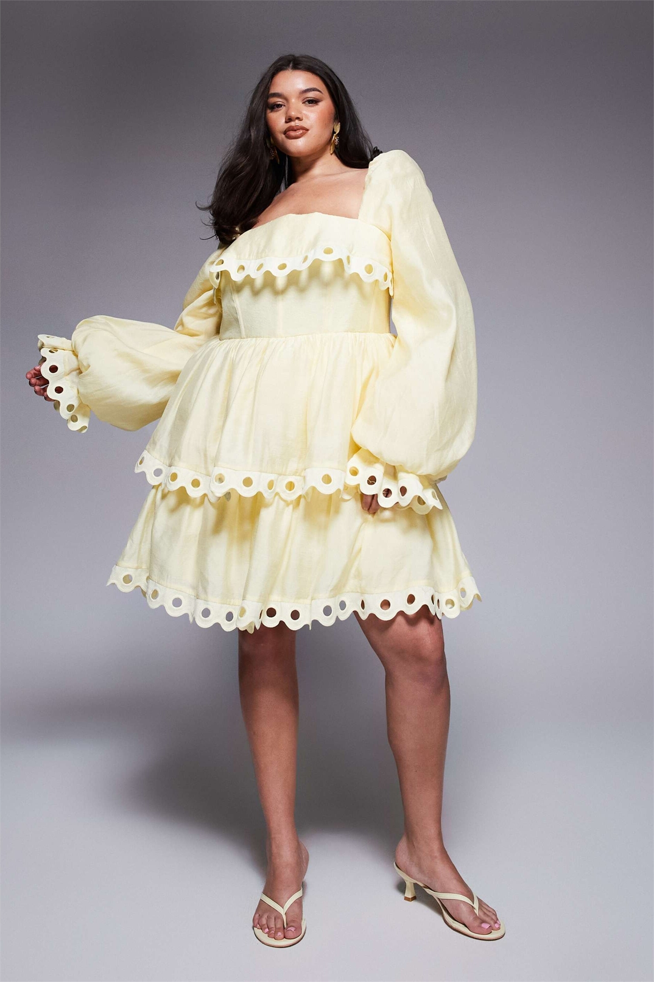 Мини-платье с волнистым силуэтом, многослойными рукавами-буффами и вырезами