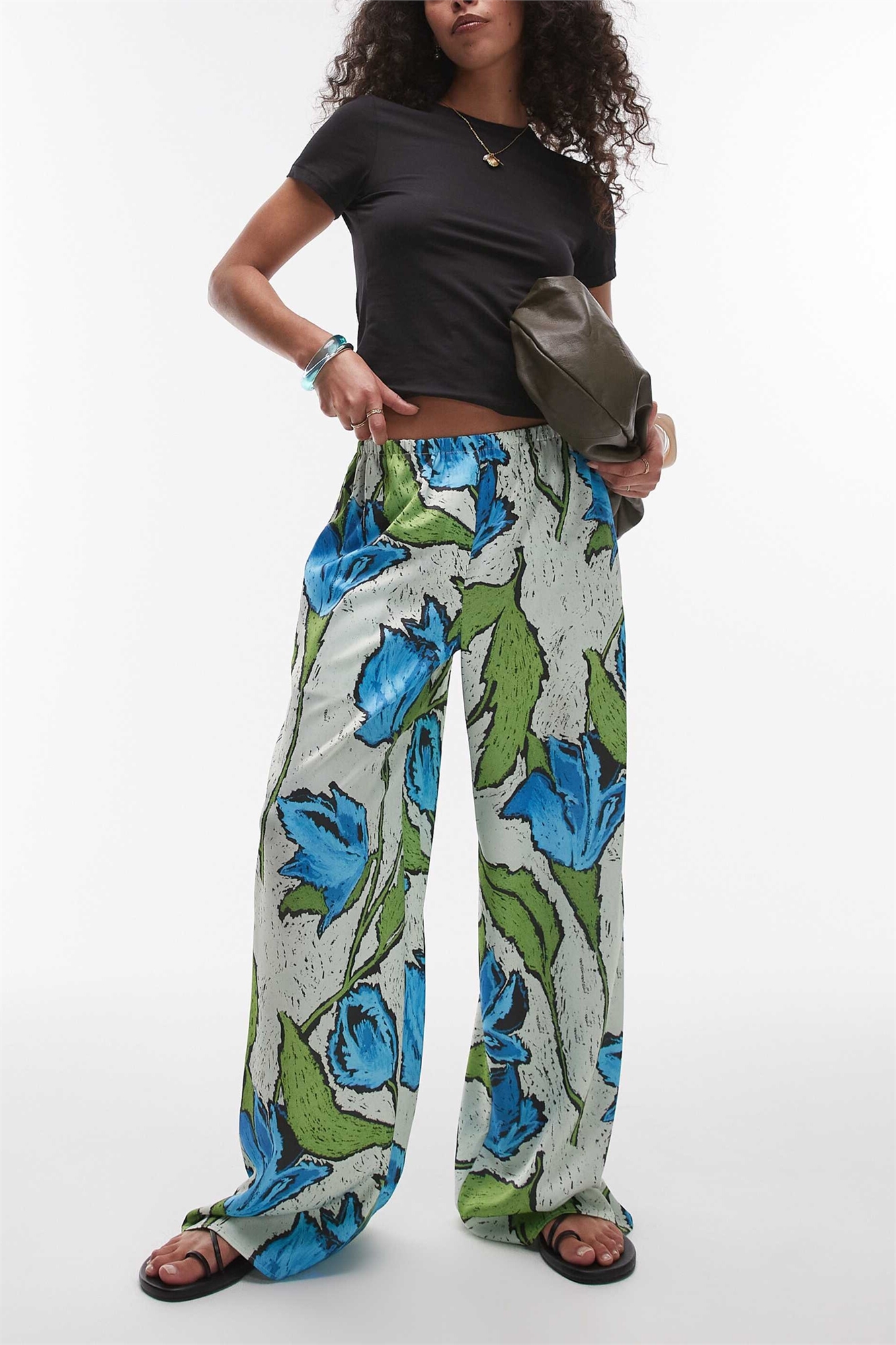Широкие брюки из атласа с цветочным принтом в зеленых и голубых тонах, надеваемые через голову