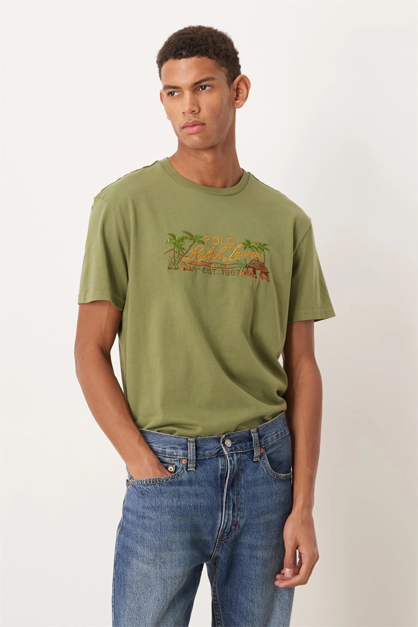 Хлопковая футболка с вышитым логотипом в виде пейзажа, классический крой свободного покроя
