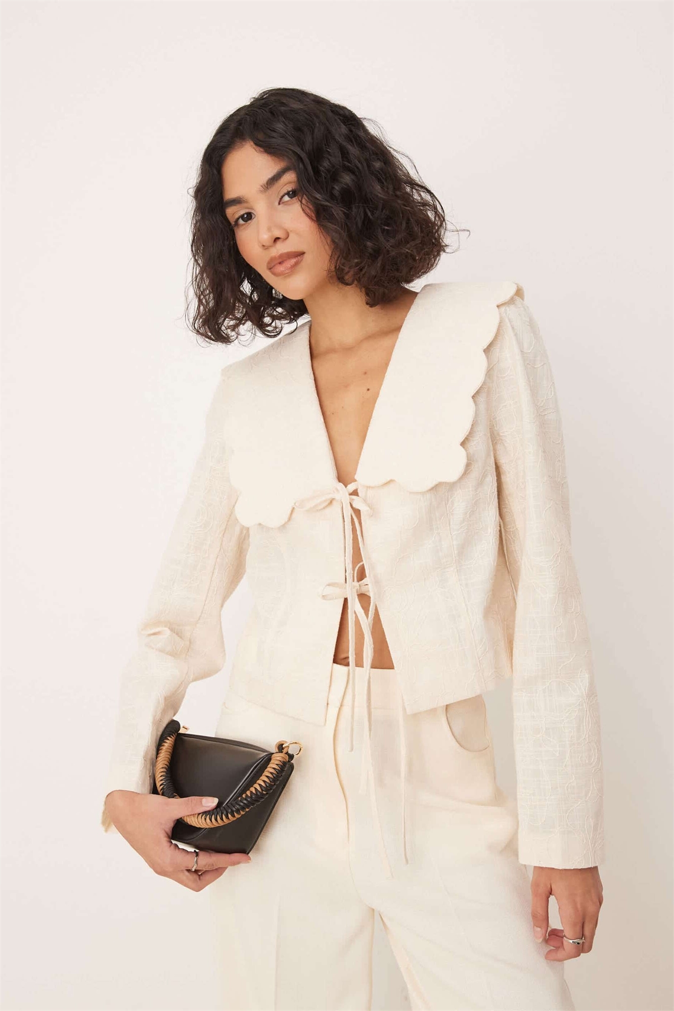 Жакет с воротником-хомутом и завязками спереди, скроенный по фигуре