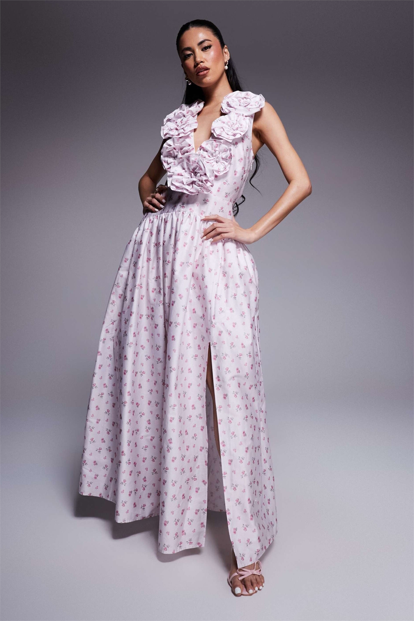 Макси-платье с глубоким вырезом, заниженной талией и корсажем