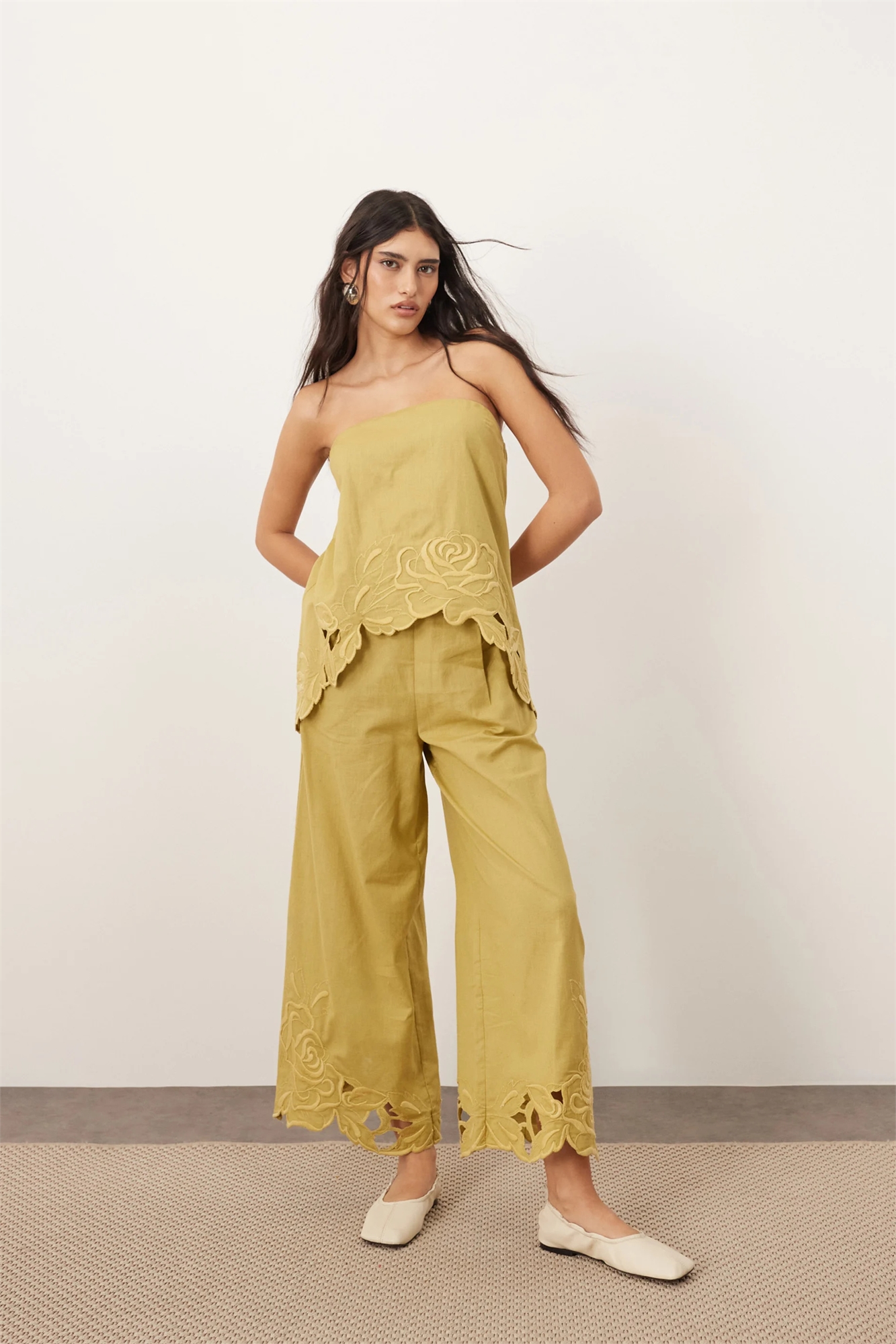 Брюки из хлопка с вышивкой в виде цветочных ажурных узоров co-ord