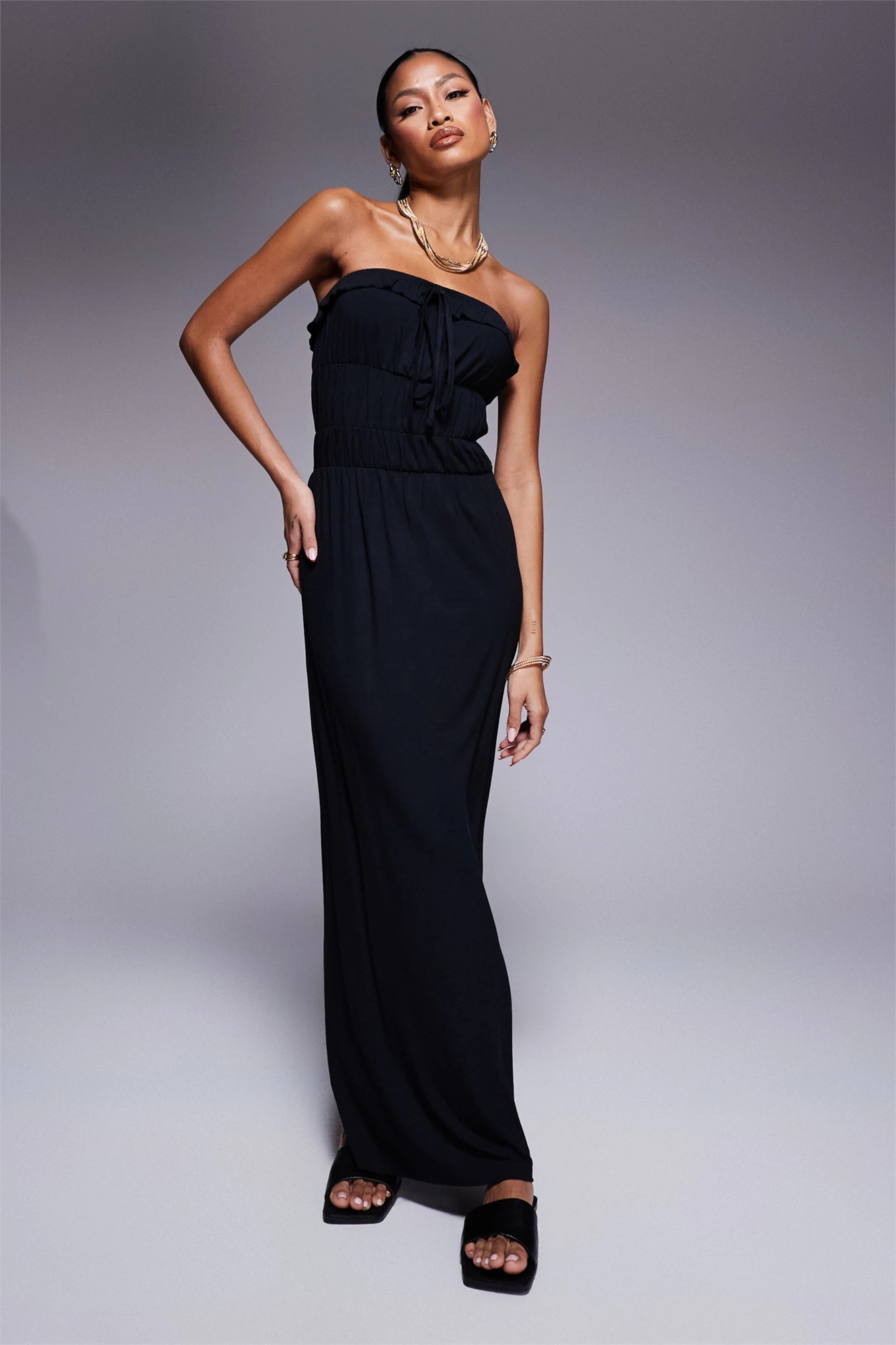Макси-платье с бандо, оборками и многослойной талией
