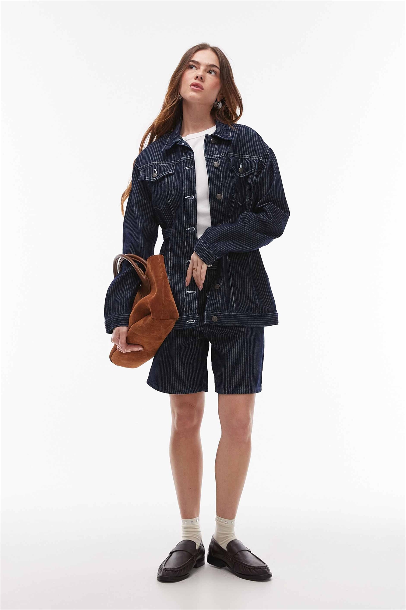 Неэластичный деним: темно-синяя стирка Основной материал: 100% хлопок, подкладка: 64% полиэстер, 36% хлопок.