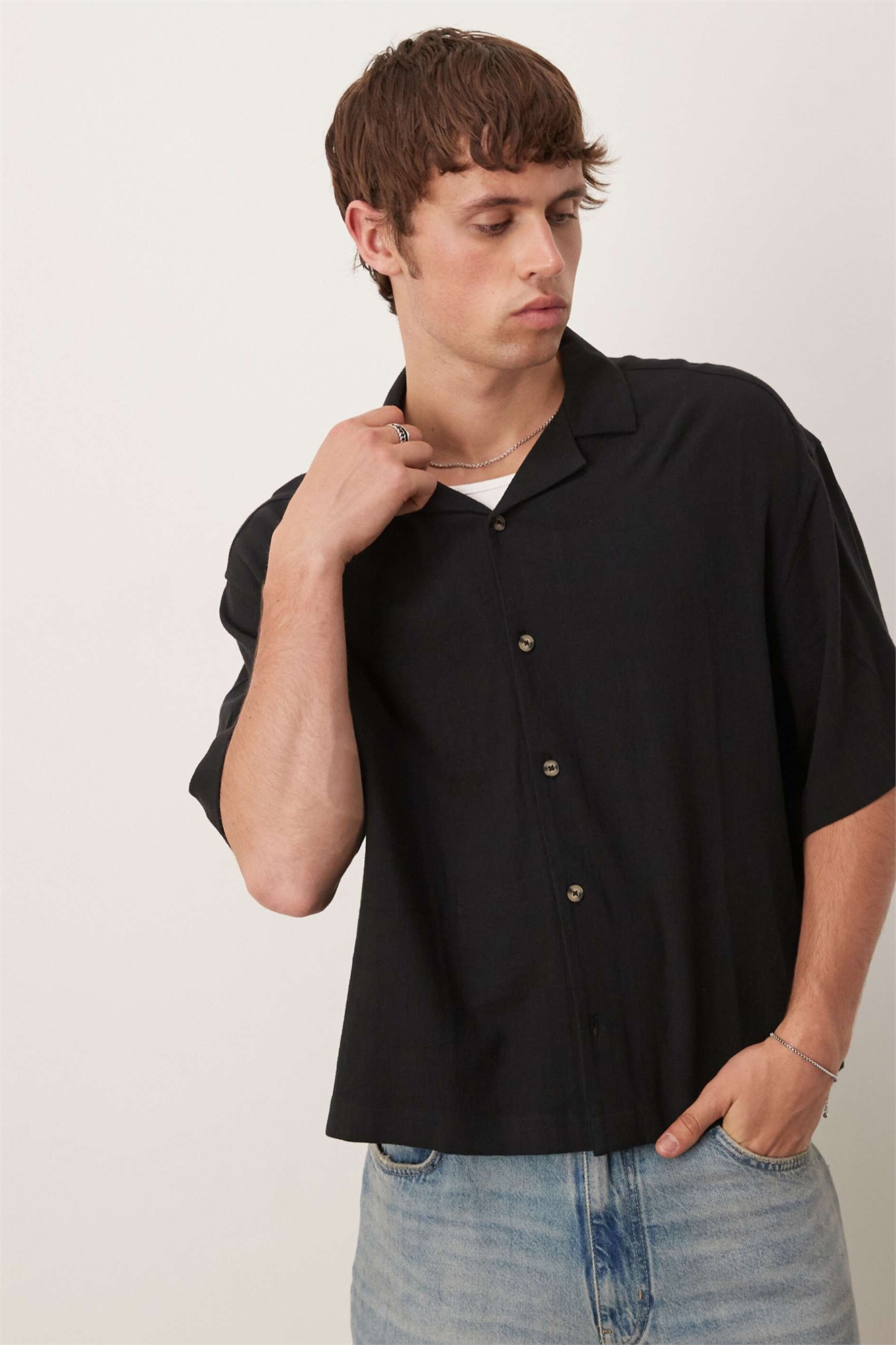 Черная рубашка из смешанного льна с объемным воротником-ревером