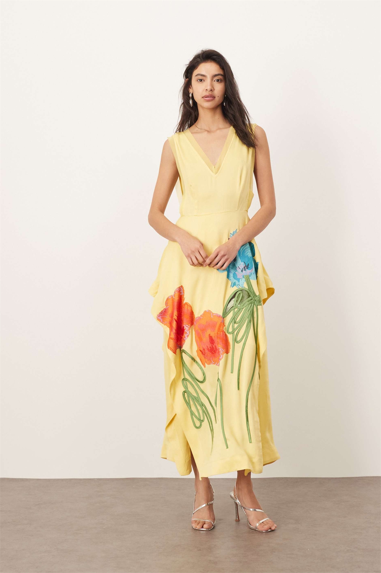 Платье-миди без рукавов с цветочной вышивкой и боковыми разрезами