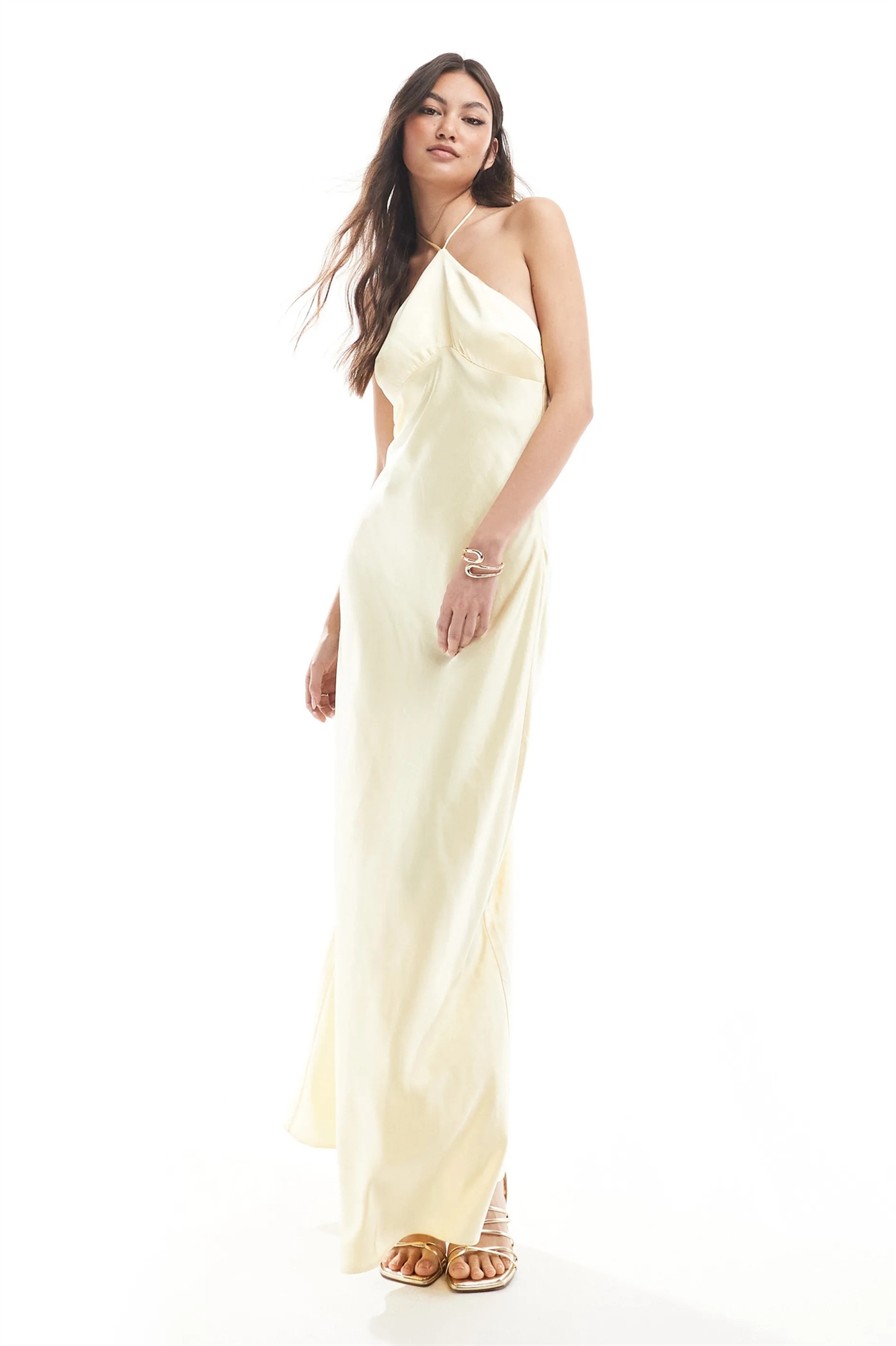 Атласное макси-платье с завязками на шее для подружки невесты