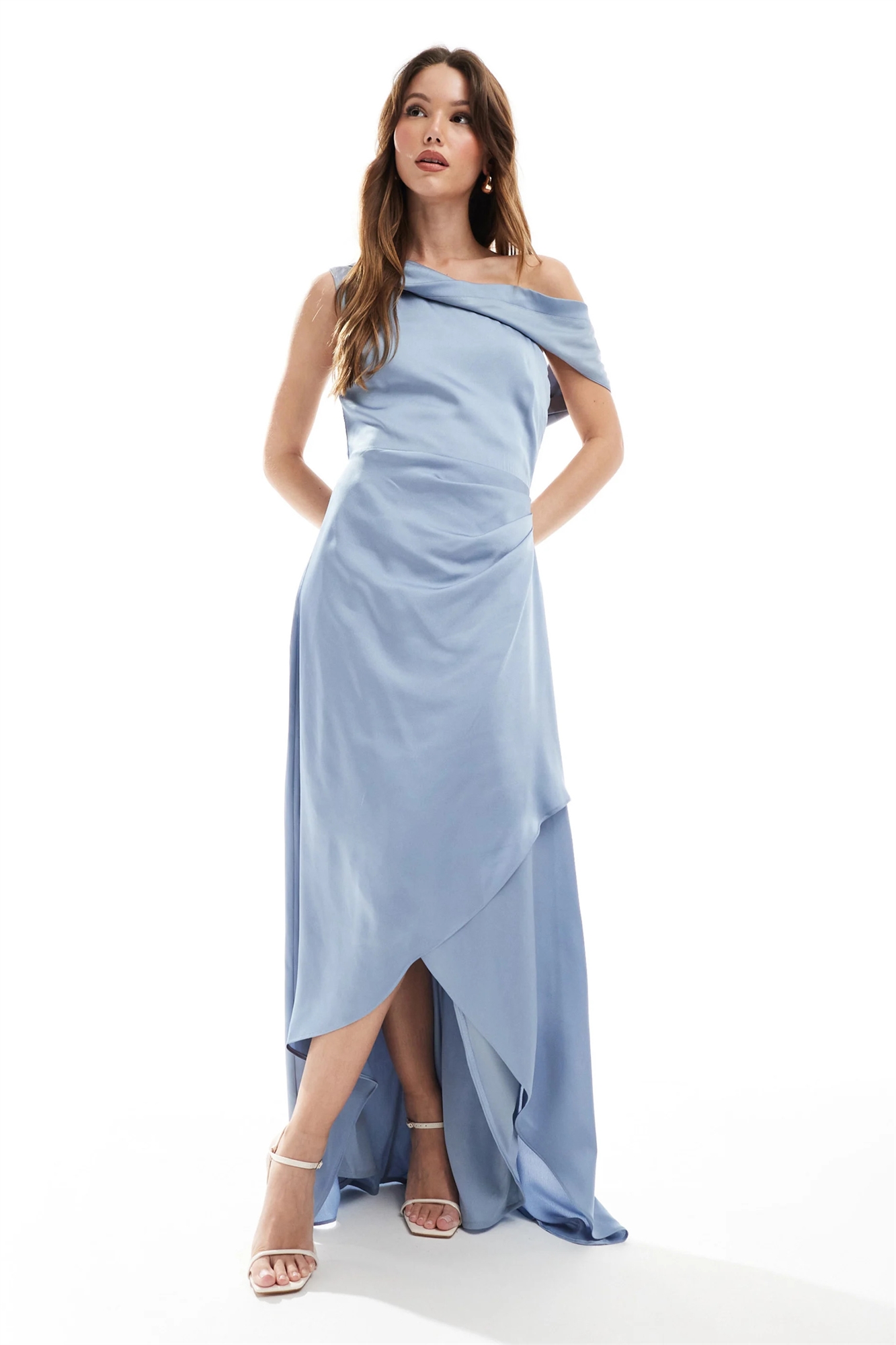 Атласное макси-платье для подружки невесты с открытыми плечами и юбкой-парео