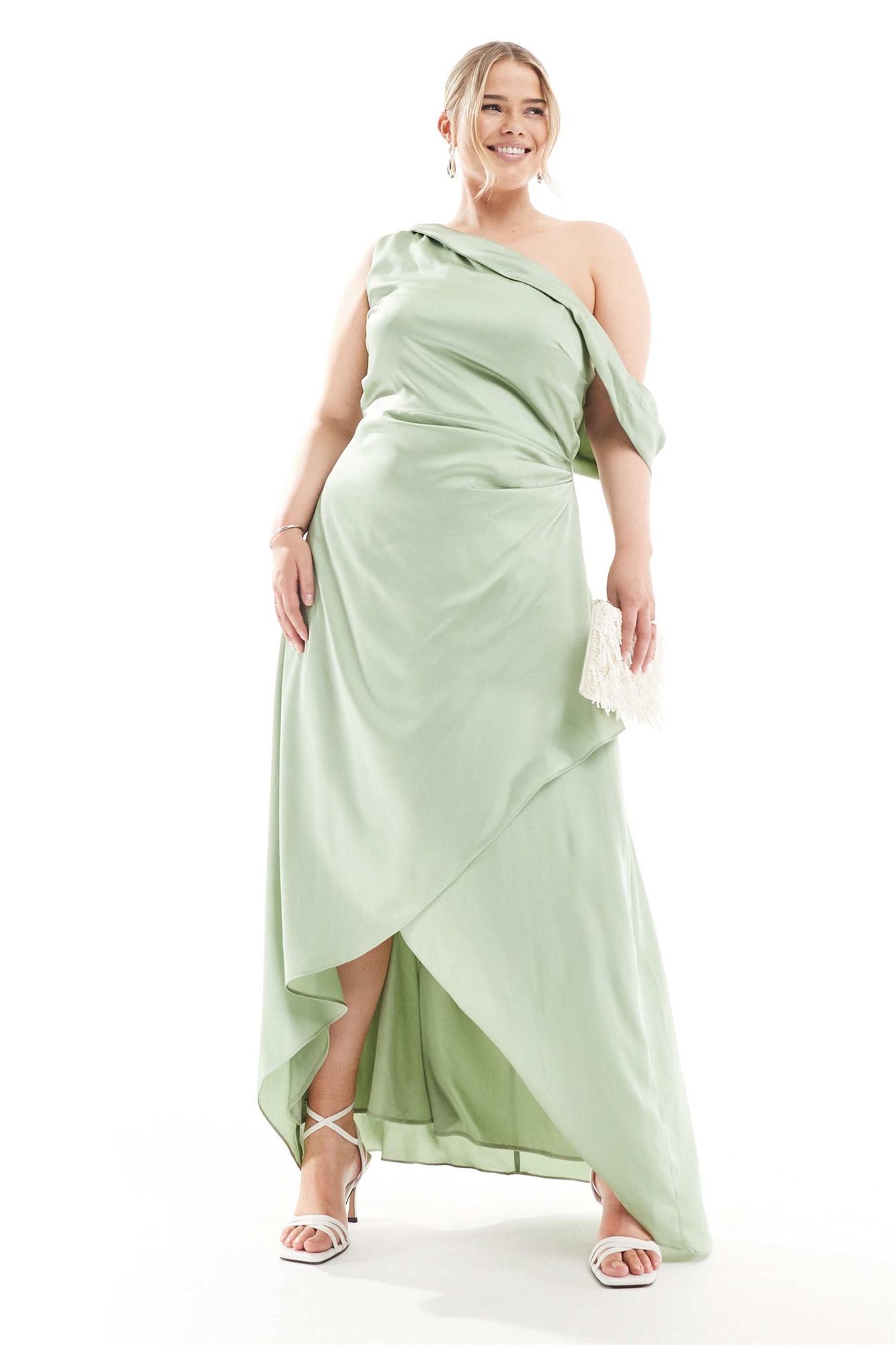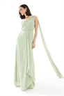 Атласное макси-платье для подружки невесты с открытыми плечами и юбкой-парео